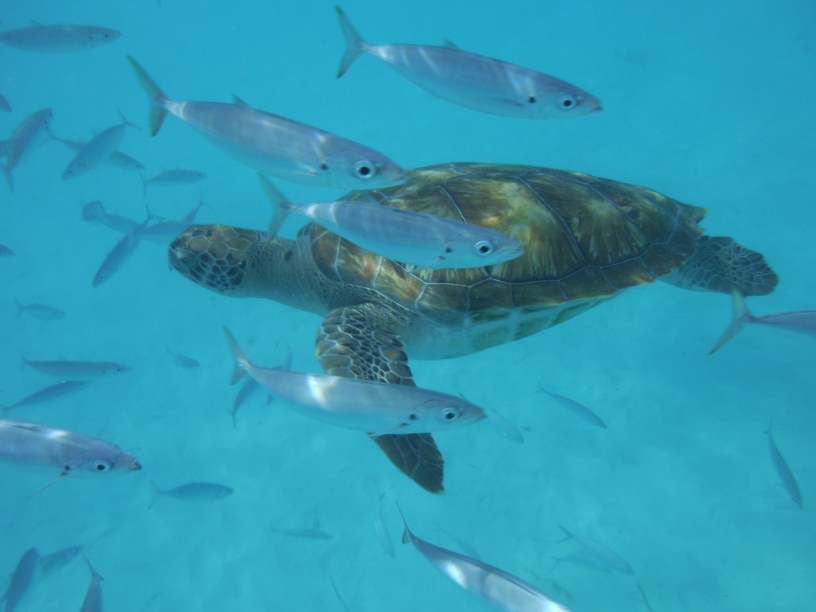 What an awesome day!!! On board the Calypso Girl by about 9:15. Nick (son) and Val (dad) were our host and captain. There were only 6 guests – the boat holds 14. Makes for a wonderful, relaxing time for us but kind of sucks for the company. One of the first questions asked was “what can i get you to drink?” The local beer is Banks. Only minutes from one of the local beaches where the sea turtles hang out, we were swimming and snorkeling soon after boarding. We only saw two turtles, a small one and a pretty big one, but it was still a very neat experience. I had never used this new under water camera and wasn’t sure what to expect. It did pretty good. I adjusted to the snorkel mask and floating pretty easy and was having a ball.