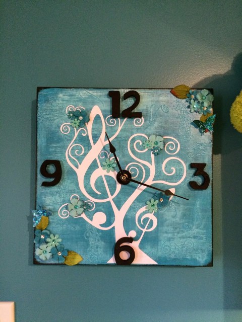 Assembling was even a challenge. I had picked up some pretty black hands instead of using the shorter gold ones that came with the kit. They didn’t work. I ended up taking them off and putting the gold ones back on. They worked beautifully … but I just didn’t really like them. A few days later I found a set of black hands at Michael’s (which is where I bought the clock parts from) hoping that they would work. THEY DID!! I LOVE the way it looks now!!