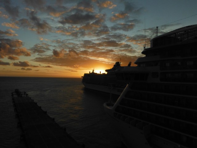 Rick was freakin’ out because he couldn’t find his glasses, so off they went try and solve that mystery. By the time we got back to our cabin we didn’t have much time before we had to get ready for dinner. Ricky was all worked up because it seemed his glasses fell out of the bag and were gone. That really sucks. He needs his glasses to function. I would’ve been upset too. That’s a big deal. A little later it was discovered that Kathy had them all along. Thank God. She was one of the last ones off the ship and saw them sitting on the table, thought they were theirs and tossed them in her bag. What a let down it was to see those blasted luggage tags on our bed this afternoon. Reality still refusing to set in. I’m determined to milk every moment out of this week.