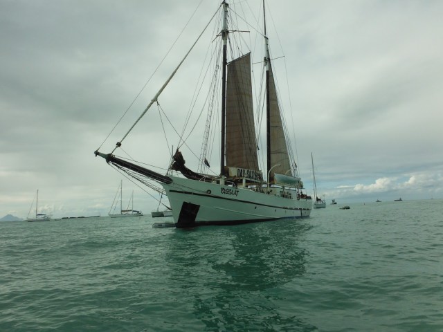 We made it to Skip Jack Restaurant (the drop off) with a few minutes to spare but Mirian was chomping at the bit waiting for us. The rest of the passengers were already on board. We piled into the dingy and motored out to the ship. It was pretty from a distance.