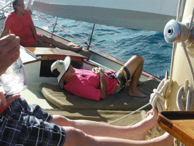 It felt so good to sail. It’s just so peaceful. Our first stop was Honeymoon Beach, St. John. See? We did go to St. John. Jim even swam to the beach and stood on it. So he’s really been to St. John. The water felt amazing. It felt quite a bit warmer than Barbados. God it’s such a gorgeous shade of turquoise, it’s just hard to describe. But I can still see it in my head. The snorkeling was really nice, especially by the small reef was swam to. While we were in the water Deb was busy getting our lunch together. Rick’s wife does most of the cooking but Rick said he was up early cooking the chicken this morning. All of it was delicious, and the presentation was beautiful. Deb picks the flowers on her way to the marina in the morning.