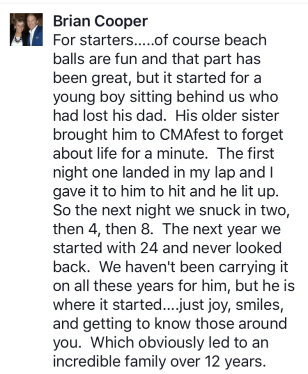 Then the nighttime concerts at the stadium! Wow! To see that many artists at the same venue, four nights in a row?! And to hear 60,000, 70,000+ fans sing the words back to the artist? It’s an experience you just can’t explain to someone who hasn’t been there, done that. Chills, from my head to my toes. Then came The Beach Ball Boys. Wow. I don’t think we were in their section our first year. But the second year we definitely were. What bloody fun!!!! It was so much fun. We didn’t know anything about these guys at this point except they got beach balls in and passed them out to our section with a plan on when to release them. I didn’t know the back story of how, or when, it all started – I just knew it was fun! And it added so much to the evening! Fast forward a little, I stumbled across their Facebook page “Beach Balls at CMA Fest.” You’d have thought I hit the lottery!! I was so stoked!! How cool is it that they have their own Facebook page? So that year we got to meet them. And that was the beginning of a friendship that will last forever. These guys, and this “family” they’ve created at CMA Fest is unlike anything else you’ve ever seen or been a part of. It was a huge part of why we went back every year.