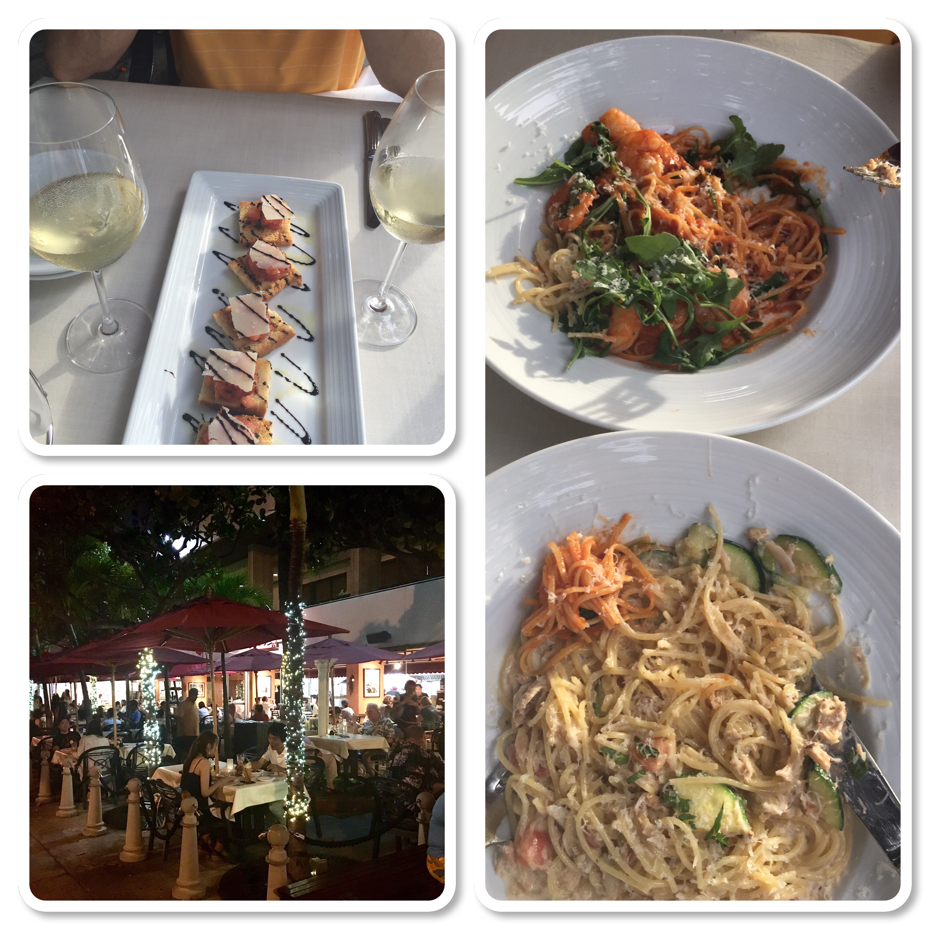 Between the early morning, light lunch and all the walking and sweating we was hungry! I was craving pasta so Bob found an Italian restaurant (Arancino) about a quarter of a mile away from the hotel that specialized in Asian Italian seafood dishes. Yummm! We were able to sit in the outside dining area and enjoy the breeze while the sun was going down. A couple of glasses of pino Grigio, some bruschetta for an appetizer and pasta for dinner had us waddling out of there.