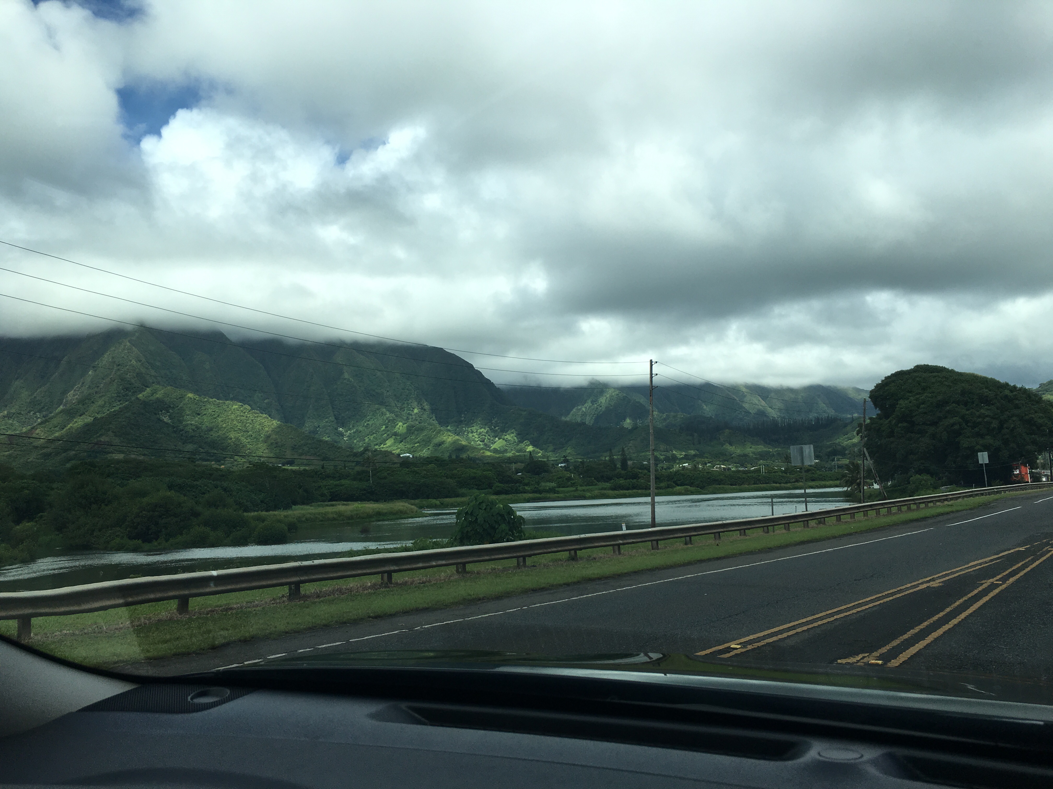 It took about an hour to climb and about 20 minutes to come back down. But we didn’t stop for pictures on the way back down either – or to catch our breath. I got a t-shirt to commemorate my climb. Bob didn’t see anything he couldn’t live without. We made it back to our car (and yes it was still there and unharmed, thank goodness), and headed towards Hanauma Bay. I guess we just drew the short straw today when it comes to crowds. We were turned away from that parking lot too – it was full. The attendant just said to try back later. Ummmm, really? We thought about it – for maybe 5 minutes. Decided to skip waiting and trying again and just started the drive to Haleiwa (pronounced Ha-lee-va). We could’ve taken the more direct route up the interstate through the middle of the island, or the longer scenic route up the east coast. My vote was the scenic route since we’ll be coming back to Honolulu by interstate on Thursday. The scenery was beautiful. The mountains are so different than any others we’ve seen before. The way they’re shaped almost look as if they’re ruffled. It so neat. The combination of these lush green ruffled looking mountains with fluffy low hanging clouds sitting on them make for a dreamy image. Unfortunately, there really wasn’t anywhere we could stop and take nice shots. The road goes through towns with houses and small businesses on either side. So even if we had pulled over on the side of the road to snap a few shots it wouldn’t have done them justice.