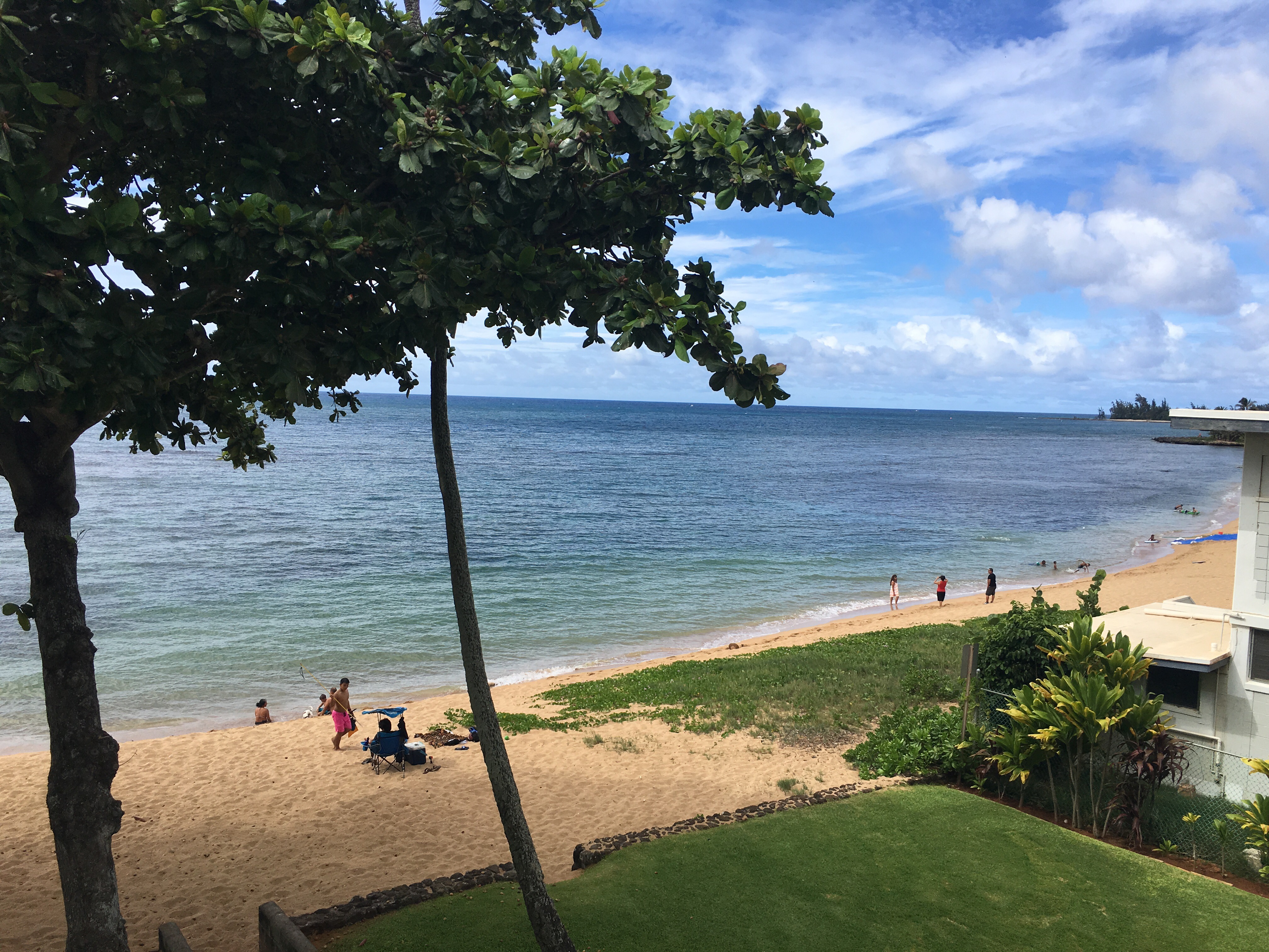 We ended up at Haleiwa Joe’s – a popular restaurant right on the marine. From what we’ve read it’s a great spot for a sunset dinner. A beer, some shrimp for me, a fish sandwich for Bob and football on the tv made for a great lunch. We stopped by the little market for a few groceries and finally got to our condo around 2:00. Look at our views!