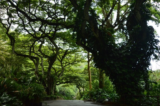 We knew today was going to be a long, busy day. Cramming as much in as possible we started off at nearby Waimea Valley to see the falls. The clouds had been hanging low all morning and of course started leaking before we even made it to the ticket counter. It is, after all, a rain forest. And, of course, we left our rain jackets back at the condo. Good thing we won’t melt. The walk to the falls is through gorgeous manicured gardens where everything is labeled on a wide paved path. Easy peasy. Thankfully, the incredible trees provided pretty canopies for cover when having to dodge the raindrops.