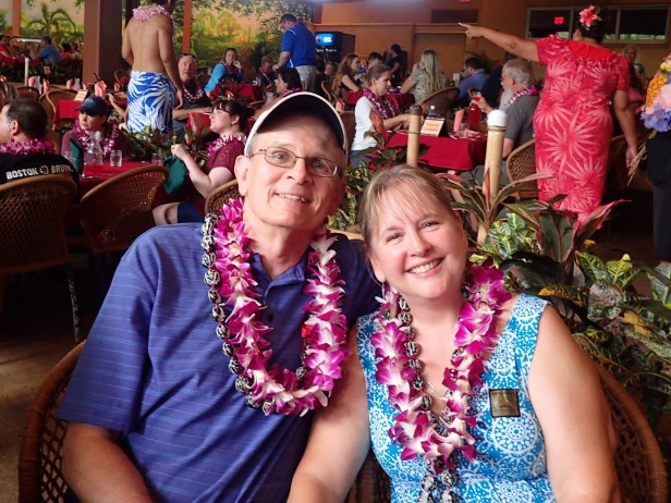 And another lei <grin> – a flower one this time. So pretty! The food was good and the show very entertaining. I took more video than pics just because it captured the moment so much better. Our luau hostess was amazing. I don’t remember her name but she thoroughly enjoyed her. I don’t know how those people do that every day, day after day. I know they have rotating performers but even so, there is so much enthusiasm and energy it just blows me away. Our hostess wanted to make sure she recognized any birthdays or anniversaries or any kind of celebration from those in the audience. She walked around the asking as many tables as she could if they were celebrating anything. Of course when she got to our table Bob made sure he told her it was my birthday last week, then I told her we were celebrating our 30th Anniversary. Oh she was all about that. After the break when she resumed hosting she asked for everyone celebrating something to come up on stage. O. M. G. Really? Yes really. We weren’t gonna. But when all these other people started filtering down to the stage, we ended up following suit. Then she started talking about anniversaries and love and … Dancing. O. M. G. Again. Bob muttered to me, “that ain’t gonna happen.” Ha! As we were swaying with the rest of the stage I asked him what happened to the “ain’t gonna happen?” “Well, didn’t look like we had much choice, did it?” Again, thankful there are no pictures or video – or if there are either one, we (or anyone we know) don’t know they people and will never see them again.