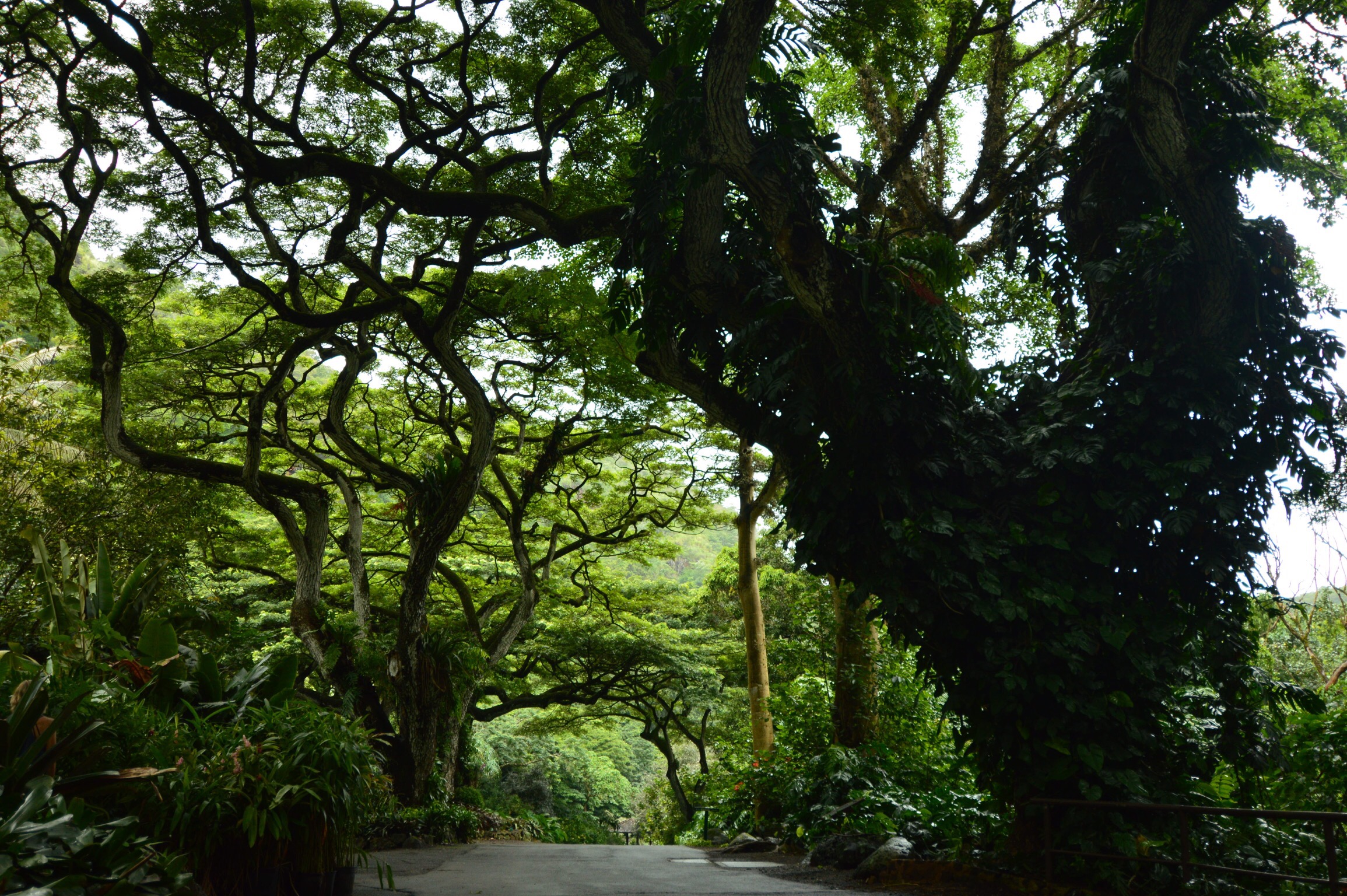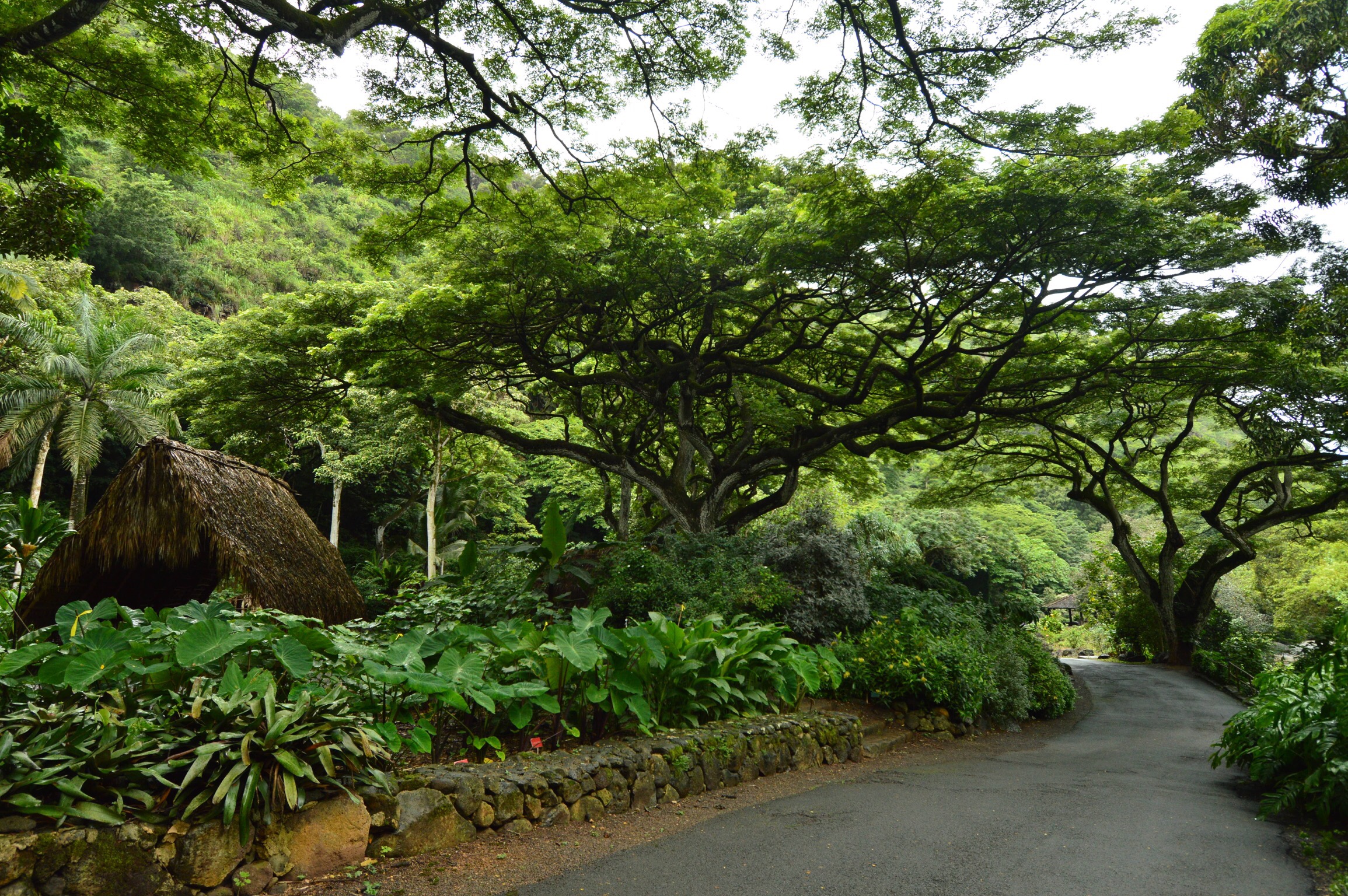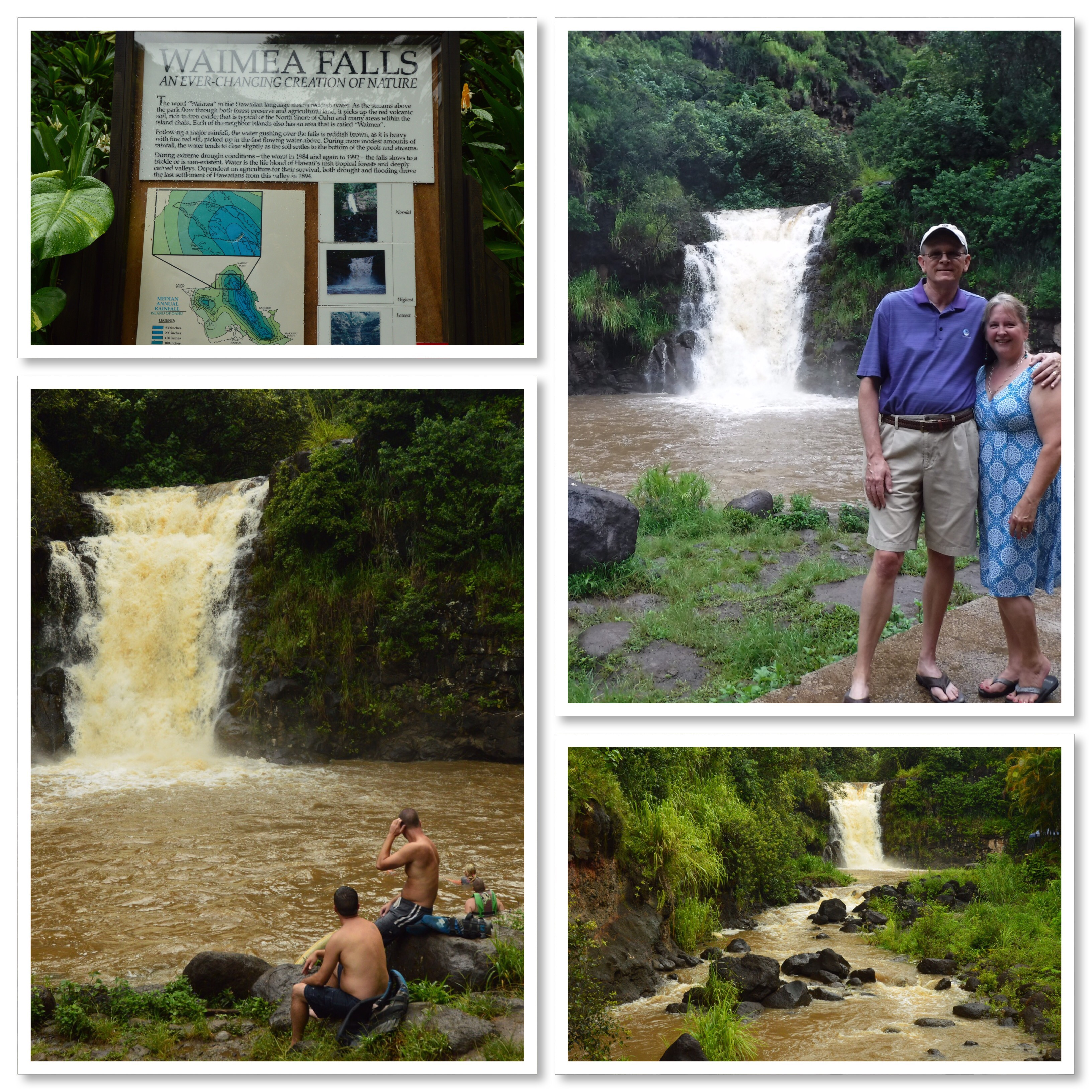 We knew today was going to be a long, busy day. Cramming as much in as possible we started off at nearby Waimea Valley to see the falls. The clouds had been hanging low all morning and of course started leaking before we even made it to the ticket counter. It is, after all, a rain forest. And, of course, we left our rain jackets back at the condo. Good thing we won’t melt. The walk to the falls is through gorgeous manicured gardens where everything is labeled on a wide paved path. Easy peasy. Thankfully, the incredible trees provided pretty canopies for cover when having to dodge the raindrops.