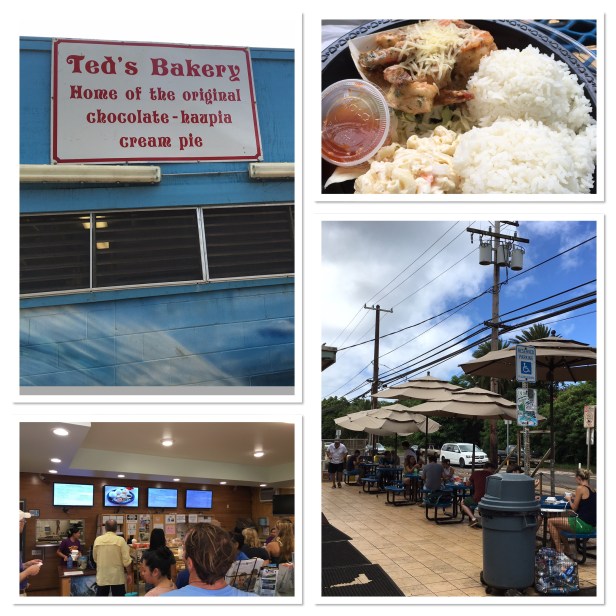 On the way to the Polynesian Cultural Center we stopped at a recommended local dive, Ted’s Bakery, for lunch. (This was one of the places mentioned several times in the guestbook at the condo.) We almost passed it. We love local dives so this was perfect! Parking was packed. The line was almost out the door and seating was limited. We both decided on the garlic shrimp (needed something to compare to Giovanni’s). I managed to grab a vacant table while Bob was ordering.