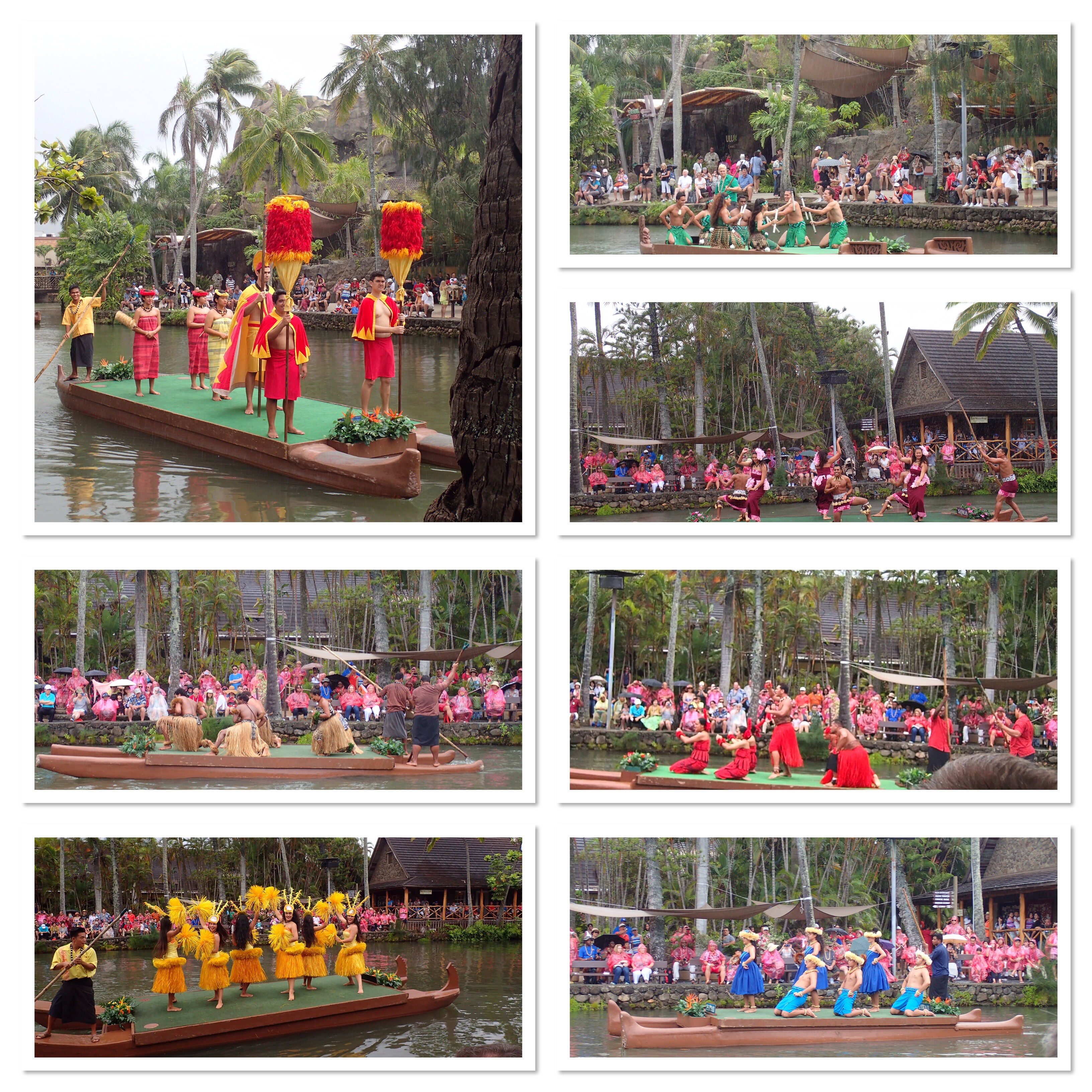 We didn’t get started until about 1:30 so only had about 3 hours to do as much as we could cram in. We managed to see four of the six islands (Samoa, Hawaii, Tahiti and Tonga), the canoe pageant (in the rain no less – you can see everyone with ponchos and umbrellas), take a hula lesson (yeah, I’m so glad that’s not on video) and a canoe ride around the property.