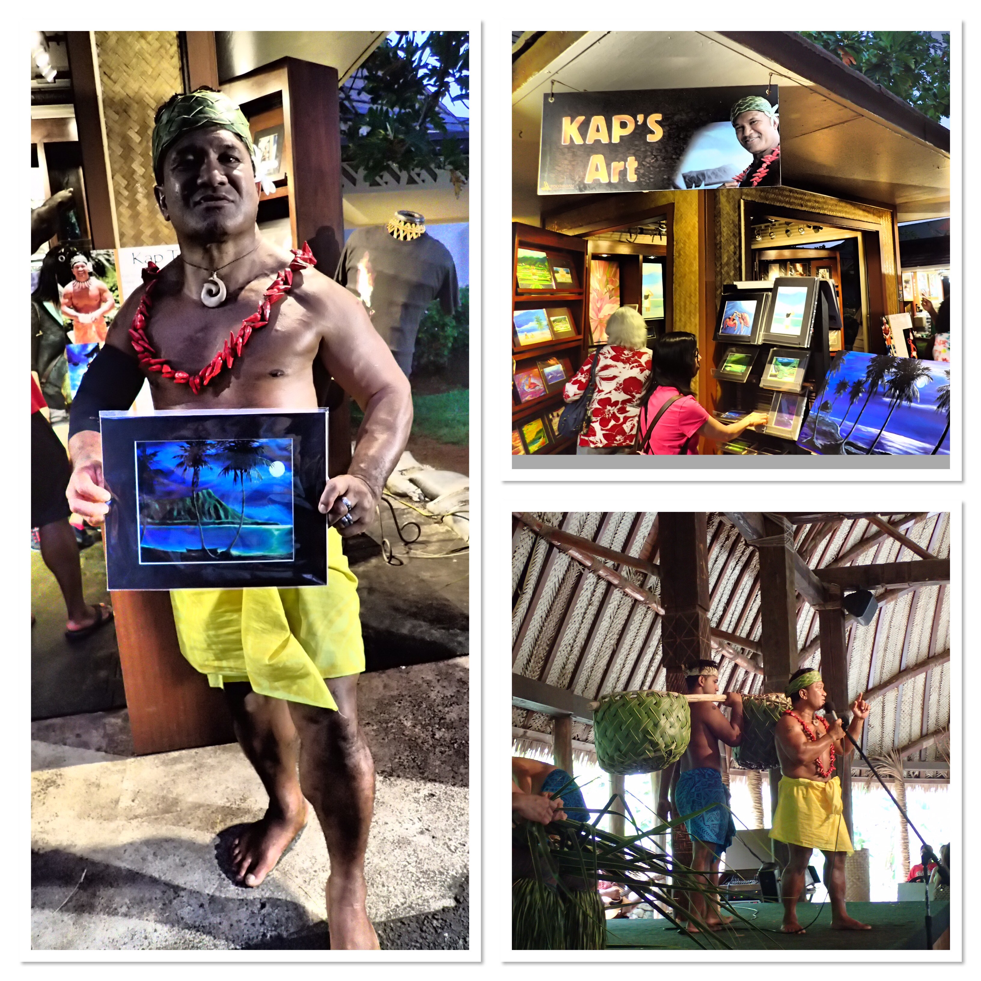On the way out we passed a kiosk with some art that caught out attention. So we stopped. There were several pieces we really liked but in the end this Diamond Head piece won. There was one with some turtles that we really liked too but Diamond Head seemed to represent this trip better to me. The artist was Kap, the chief of Samoa. He told us at the end of his show he had an art booth but we had forgotten about that until we saw his work. He autographed the piece and held it for me to snap a photo. How cool is that?