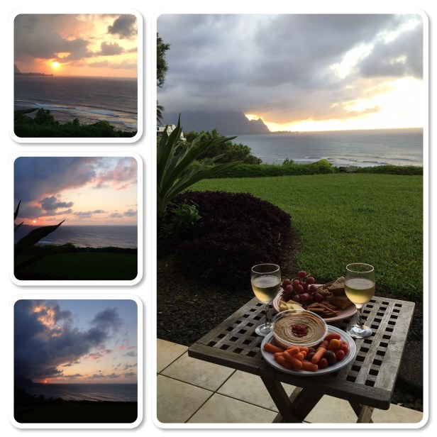 Checked in to the condo. Such a nice place and, of course, gorgeous views. There is a path down to the beach (Hideaways Beach) and we haven’t tried that yet. Will have to check that out later. Maybe in the morning. We took a trip to the local market and picked up a few things to tide us over, came back and unpacked and planted on the patio for the sunset. Deciding to eat in and nosh tonight, I fixed a plate of goodies and popped a bottle of wine. The clouds were really looking like they were going to take front and center yet again but at the last minute BOB popped out of the bottom of the clouds and shined bright.