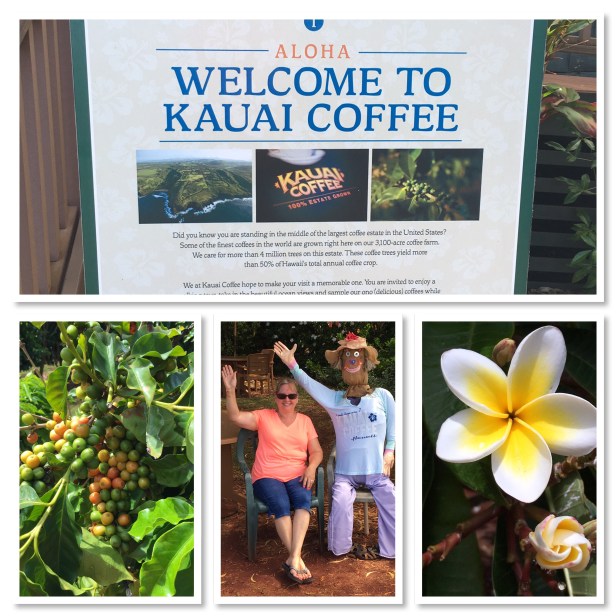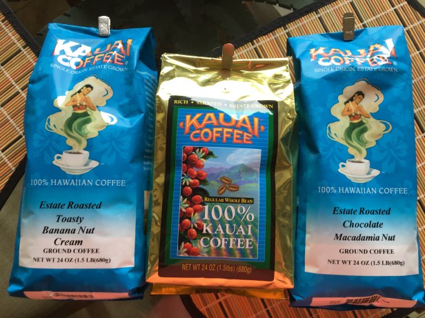 The Kaua’i Coffee Company was just down the street. I’d been looking forward to this for days. It’s a really cool company – no GMOs, they source locally and do everything (except decaffeinate the beans, they’re sent to Canada where they use a patented water process to decaffeinate them) right here on the island. Did you know coffee beans come from cherries? Go figure! We didn’t either. The skins and flesh from the cherries are put in a compost pile to be used for fertilizer the following year, they aren’t even eaten. Wonder what they taste like. Kaua’i Coffee has 3,100 acres and 4 million trees. They’re the largest coffee company in the United States. They’ve got this thing down pat. I walked away with some regular roast, some chocolate macadamia nut and some banana but cream. I can’t wait to get these bags home and make both hot and iced coffee with them!