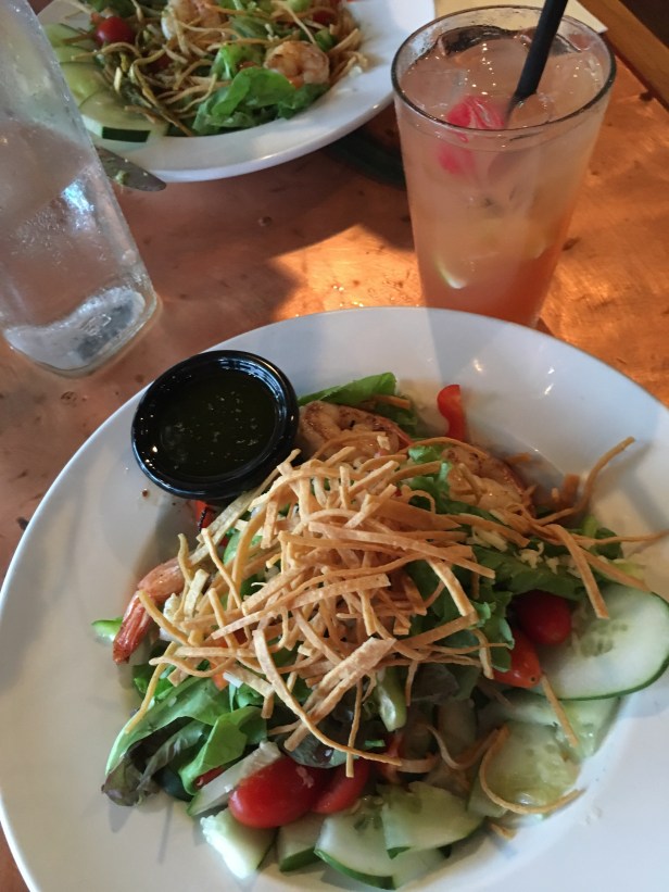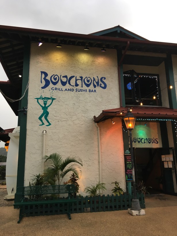 At this point Bob is done. He’s been at the wheel for the best part of the last two days. He’s ready to get back to the condo and plant for a few days. We both are. It was mid afternoon when we got back. Didn’t take much to unpack – we didn’t take much with us for only a night. We hung around, watching the sun and clouds to see if there was any possibility of color tonight – wasn’t looking good. Bob called and cancelled our boat tour of the Napoli Coast for Monday morning. Between the weather we’ve seen and what’s predicted, we’re kind of running scared. I have no desire to get out there and get sick because of being tossed around so much. So since we cancelled the boat tour, we caved and booked a helicopter tour for Wednesday morning. Exciting! I’ve never been on a helicopter before! I’m trying to get reservations to tour a chocolate farm Monday morning. We’ll see how that works out. By the time we did all that it was time to drive down into Hanalei to check out the pier, town, beach and restaurants. We were hoping Hanalei Beach would be the one that would make us want to stay. Sigh, it didn’t. We saw a couple of restaurants that looked crowded from so parked and got out to look at the menus. Son of a gun the first one we looked at had a wild caught shrimp salad with organic greens!! Jackpot!! We haven’t had a salad since we love home! I opted for a frou frou (is that how you spell that?) drink – Stay at Hanalei – with vodka, rum and fresh juices and Bob got a beer. Our server was a trip. Mickey from Denver, number 8 of 10 kids, is living her dream to live in Hawaii. She had a great laugh and happy, energetic personality. Salad was good too. Oh and by the way, it was raining again. LOL