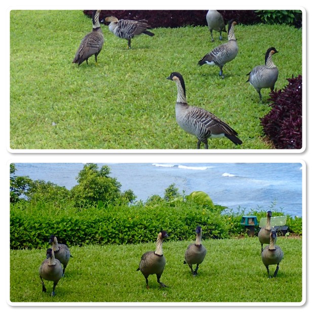 We love our visitors every day. These geese so pretty laid back and very tame. Although there is a sign saying “Please don’t feed the birds,” they act like they’re used to being fed. This bird, called the Nene (pronounced Nay Nay) is the Hawaiian state bird. They’re only found on the islands of Hawaii, Maui and Kaua’i. They’ve been an endangered species for years but are finally making a come back and according to the article I found, there are around 800 now. Knowing this makes them even more special when they come calling at sunrise and sunset.