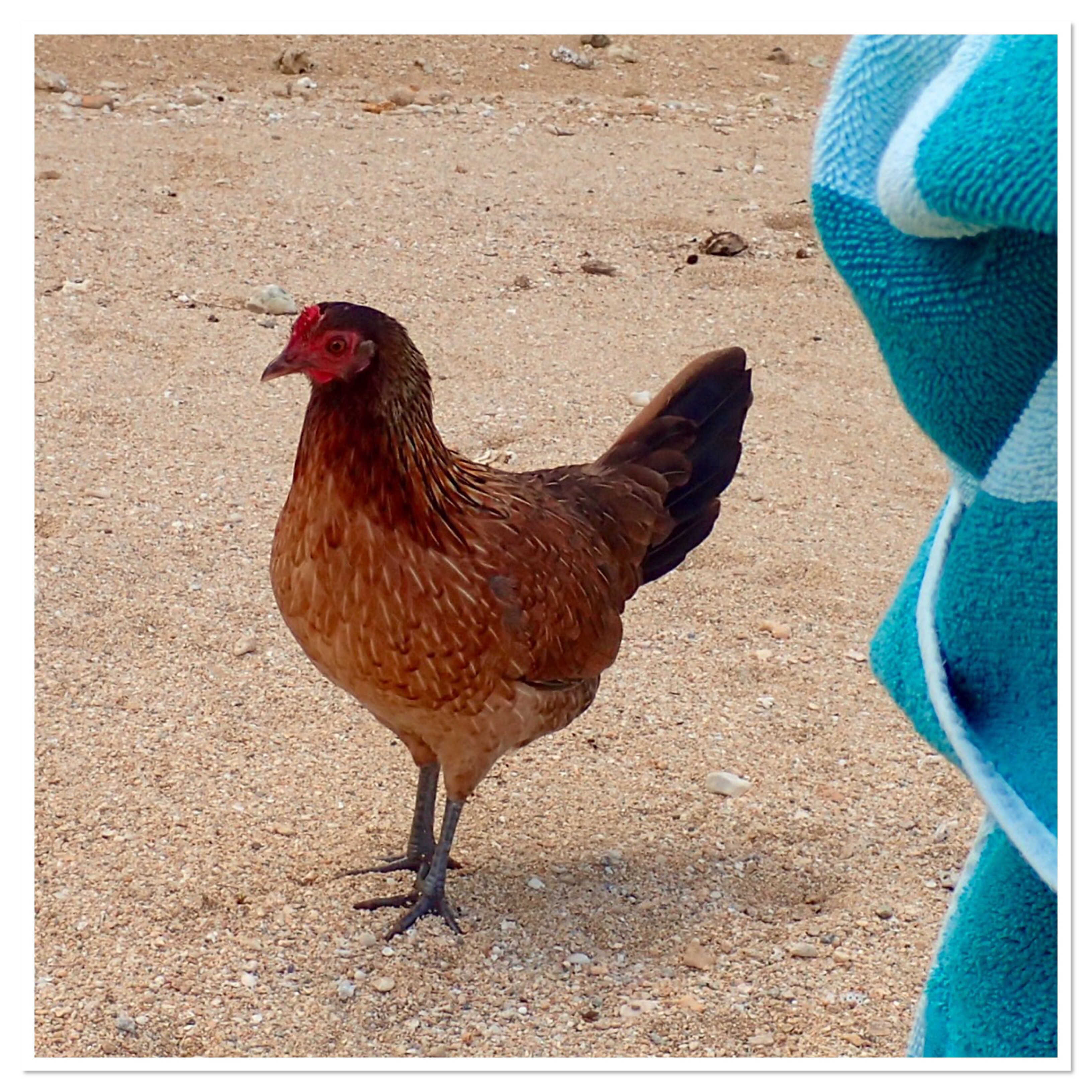 You know I have to talk about the bloody roosters again. And yes we heard them before 5:30am again. My curiosity got the better of me so I googled the chickens on Kaua’i. Apparently, Hurricane Iniki, back in 1992, destroyed a lot of chicken enclosures so they got loose and the rest is history. They’re now considered feral chickens with no natural predators. Talk about organic chicken! Or wait, you could get wild caught chicken on Kaua’i!!! Wonder how long it’ll take for someone to realize that and start a money maker. It’s not like they’re a protected animal or anything. And yes, we’re still on the hunt for a rooster shirt for Bob. Here’s one on the beach. We have seagulls, Kaua’i has chickens. SMH.