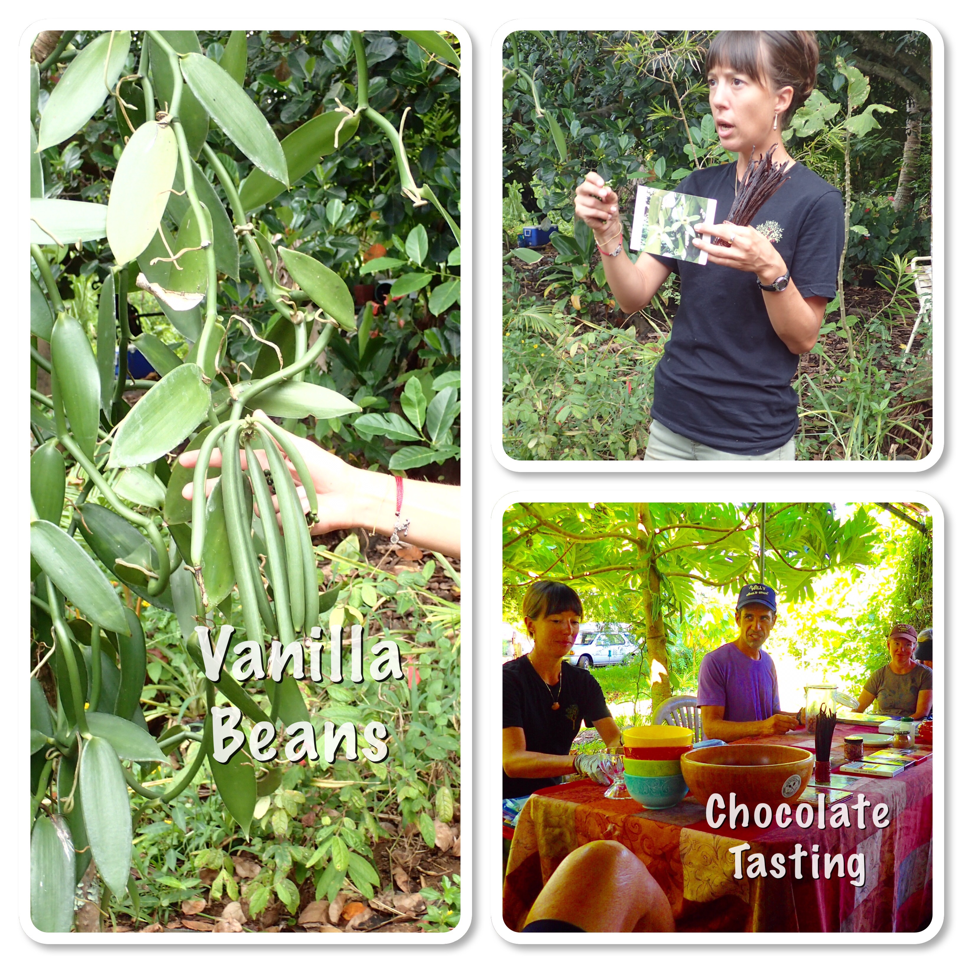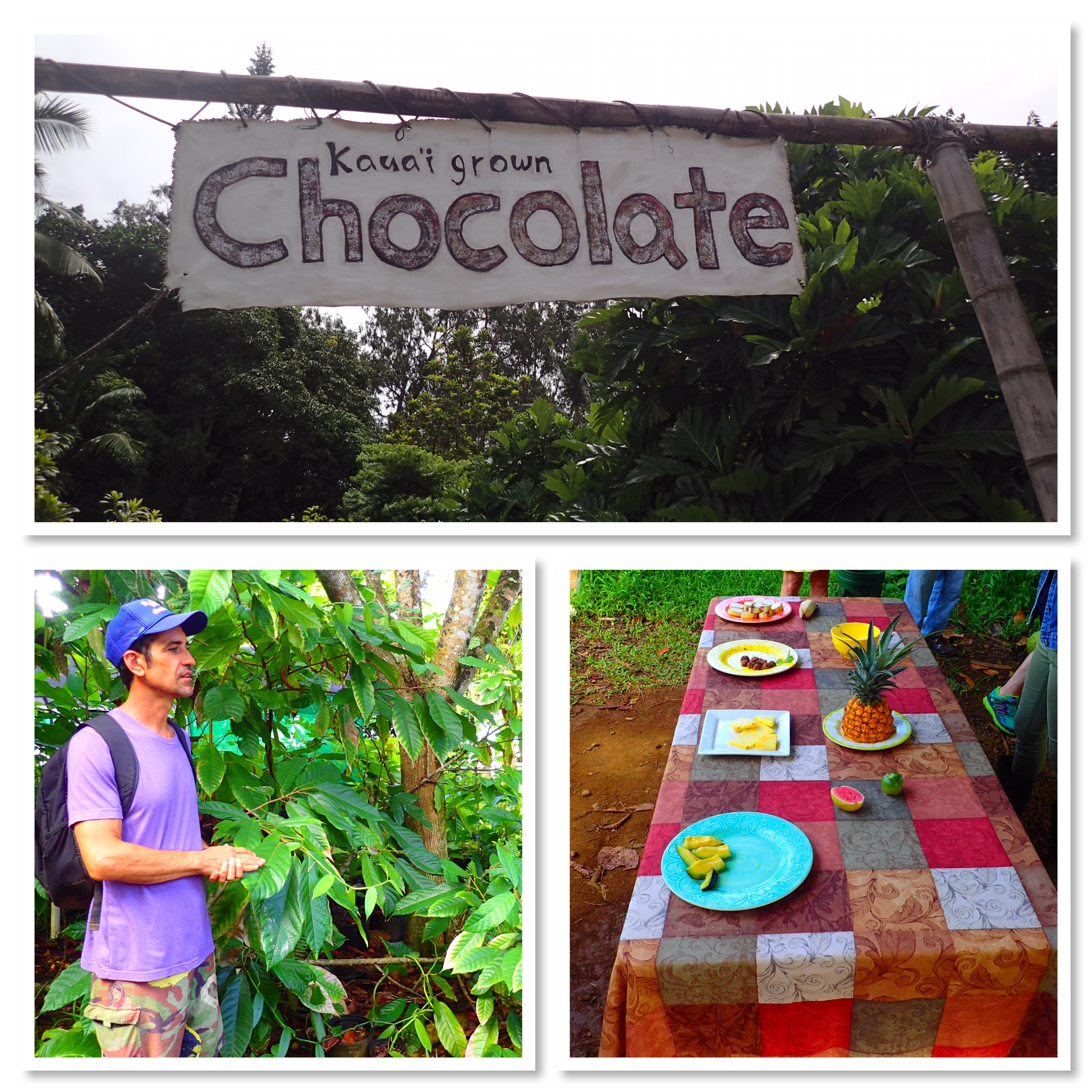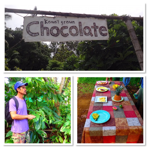 The chocolate farm tour. Wow. One of the best things we’ve done. Bob really wasn’t excited about it. He just couldn’t imagine how it could take 3 hours to talk about and taste chocolate. Shock shock, he loved it too. Coa and Angie are passionate about chocolate. Coa started this farm and business 13 years ago. This is the only cacao farm on the island that also produces chocolate. The tour started with tasting fresh fruits – pineapple, avocado, banana, sugar cane and chocolate. Scrumptious!