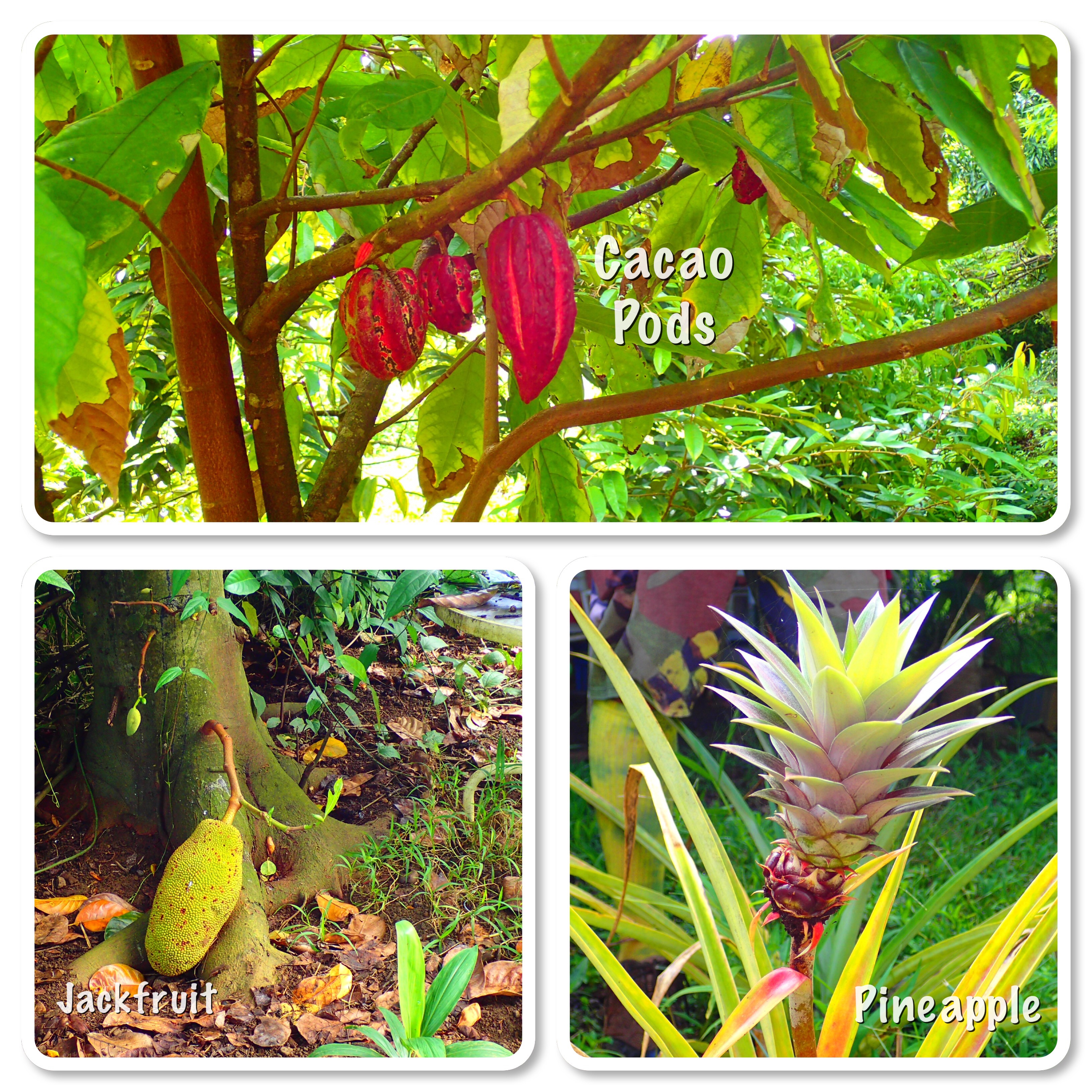 We saw lots of cacao trees in various stages of growth. They start them from seeds and baby them for about three years until they’re strong enough to plant in the ground. Have you ever heard of a Jackfruit? We hadn’t. These babies can get up to 80lbs! A popular tree on the island. We saw a baby pineapple and those red pods are cacao pods.