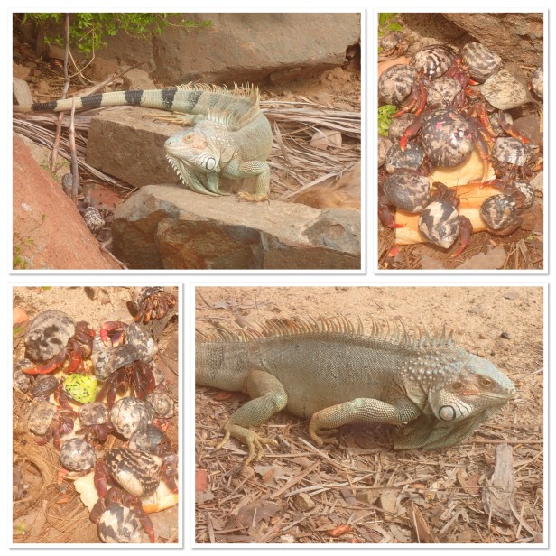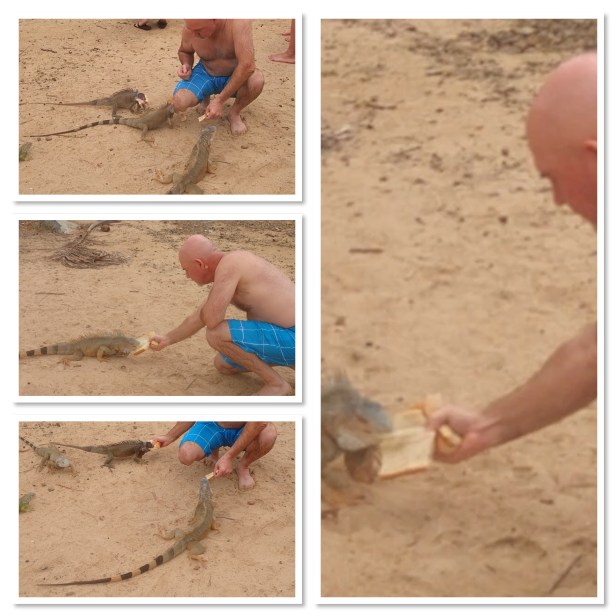 Our last stop was Pinel Island and it had a decent beach. Myles brought out some simple sandwiches that were very good – we hadn’t been expecting that. Fed a leftover one to some fish. Bob and I jumped in to enjoy some calm blue water. DE, Jesse and Jeff swam to shore and looked around. I was still bobbing in the water (Bob had gotten back on the boat) when DE came back asking Sarah for the camera. Said there was this huge iguana he wanted to photograph. Myles tossed him a couple of sandwiches to feed him. Bob tossed me my camera and I followed. What a freakin’ cool experience! There were iguanas everywhere – different colors, all sizes, eating right from people’s hands. Iguana Island is how I’ll remember that one. Love the video and pics I got. Best pics I took all day!!