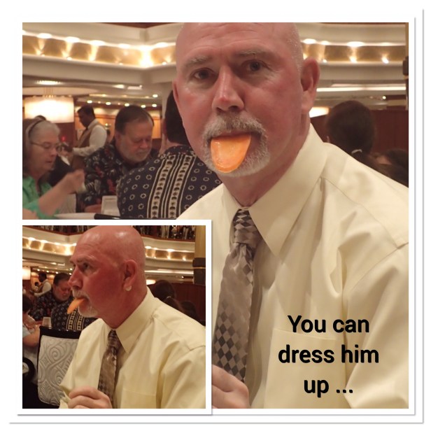 Back on the ship we dropped our stuff off in our cabin and went by the buffet for a snack. We ended up with chicken fajitas that wen’t bad. We figured that would hold us until dinner. Then we headed to the spa. That was different. We knew they had separate dressing rooms for men and woman but assumed the spa itself would be co-ed. Nope. That was disappointing. I stayed in the steam room until I started nodding off and called it quits, then just waited outside for Bob. Back in the cabin we took a half hour nap before getting showers and dressing for dinner – it was formal night. We had reservations for 6pm.
