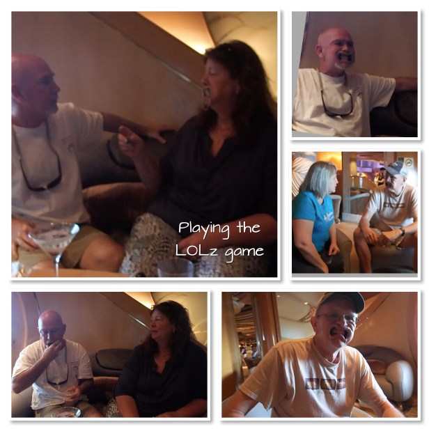 Got caught up on my journaling and a little reading done before lunch. We wanted to walk around the buffet just to see what they had for lunch and ran into DE and Sarah on the way out. Poor guy’s head is toast. We made plans to meet up after lunch in the martini lounge to play the LOLz game. I played that at Brooke’s when I flew out for Cheyenne’s graduation. OMG so much fun!! Bob and I went to the main dining room for lunch just because we could – they’re only open for lunch on sea days. Bob had a salad with corn, beans, avocado and salsa he said was really good. I ended up with a lighter meal of sweet potato soup and Caesar salad which was also good.
