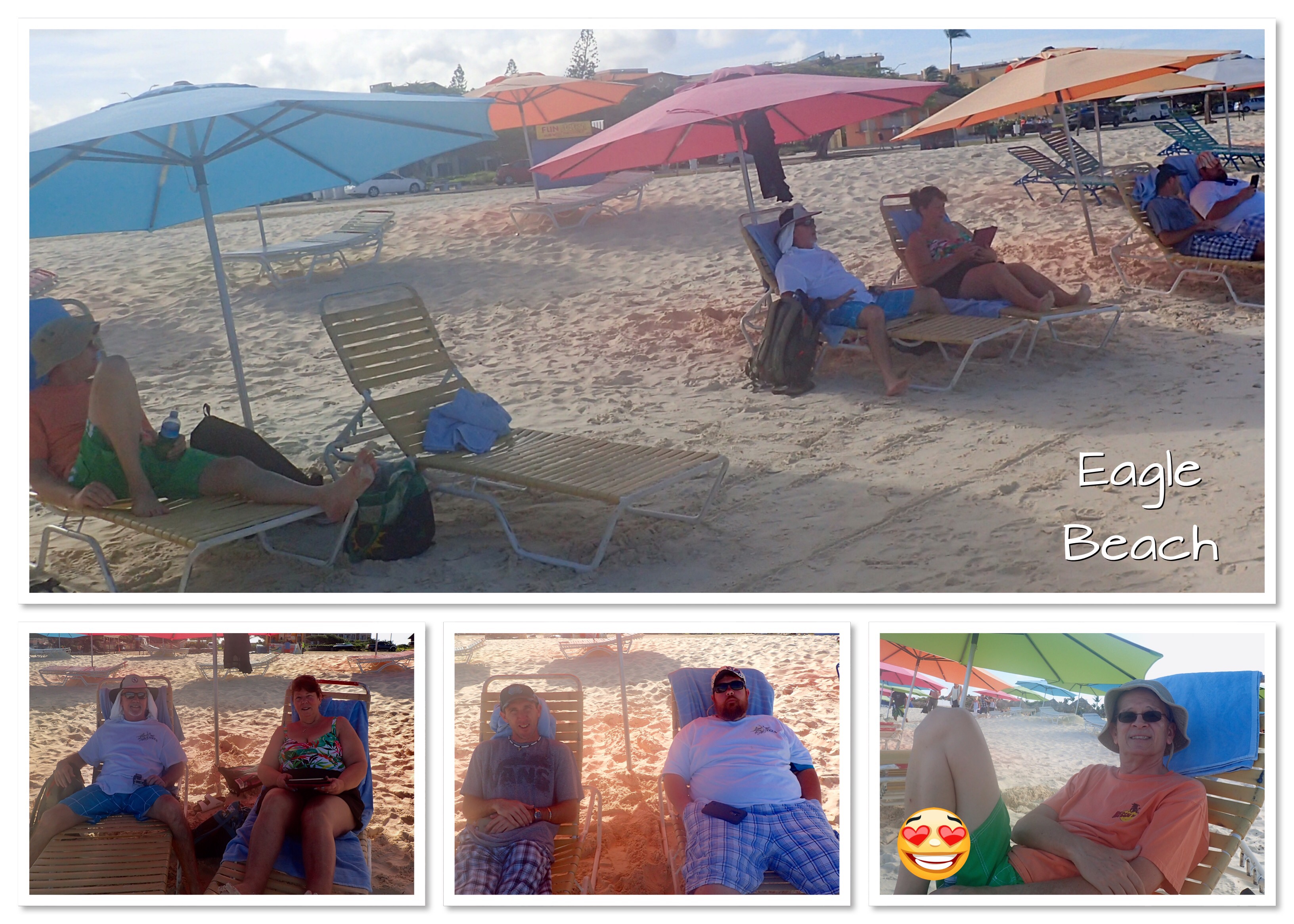 Pretty uneventful day for us today. Bob woke up not feeling great. His ear has been bothering him for a couple of weeks. He assumed it was wax buildup but we may be rethinking that theory. He’s now sounding like he’s got the crud I started with 2-1/2 weeks ago. Yup, still coughing. Thankfully, I feel better although my energy level is still not back 100%. I got my oils out and started him on them and gave him some ibuprofen before going down to breakfast. We planned to meet on the dock around 9am to grab a taxi to Eagle Beach to just hang out for the day. Bob thought he read (on the internet – apparently he believes what he reads on the internet too) it was about 45 minutes away from the pier. It was less than 15. He also thought he read you could snorkel from the beach. Our taxi driver said you could if you wanted but there was nothing to see but sand. Alrighty then. Wasn’t a big deal we just wouldn’t have brought our snorkel gear with us. By the way, in Aruba there is a limit of 5 passengers allowed in a taxi. Law. We had to have two taxis.