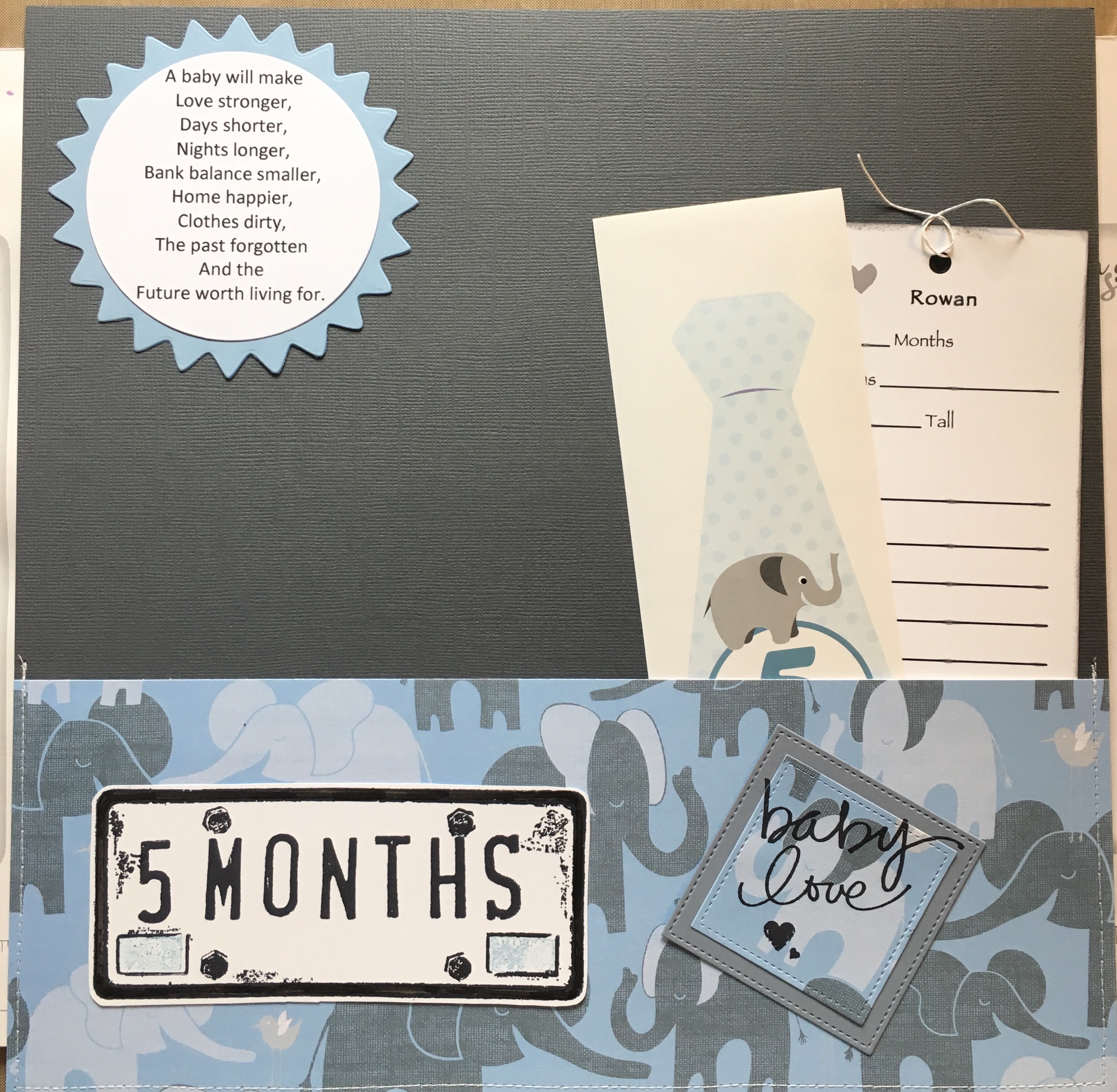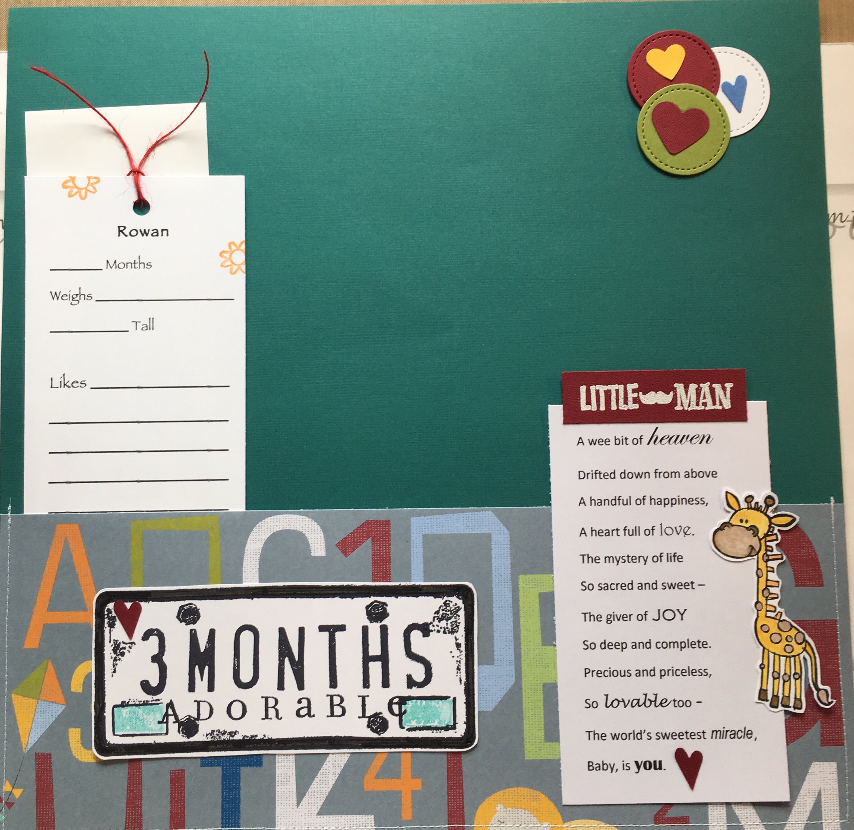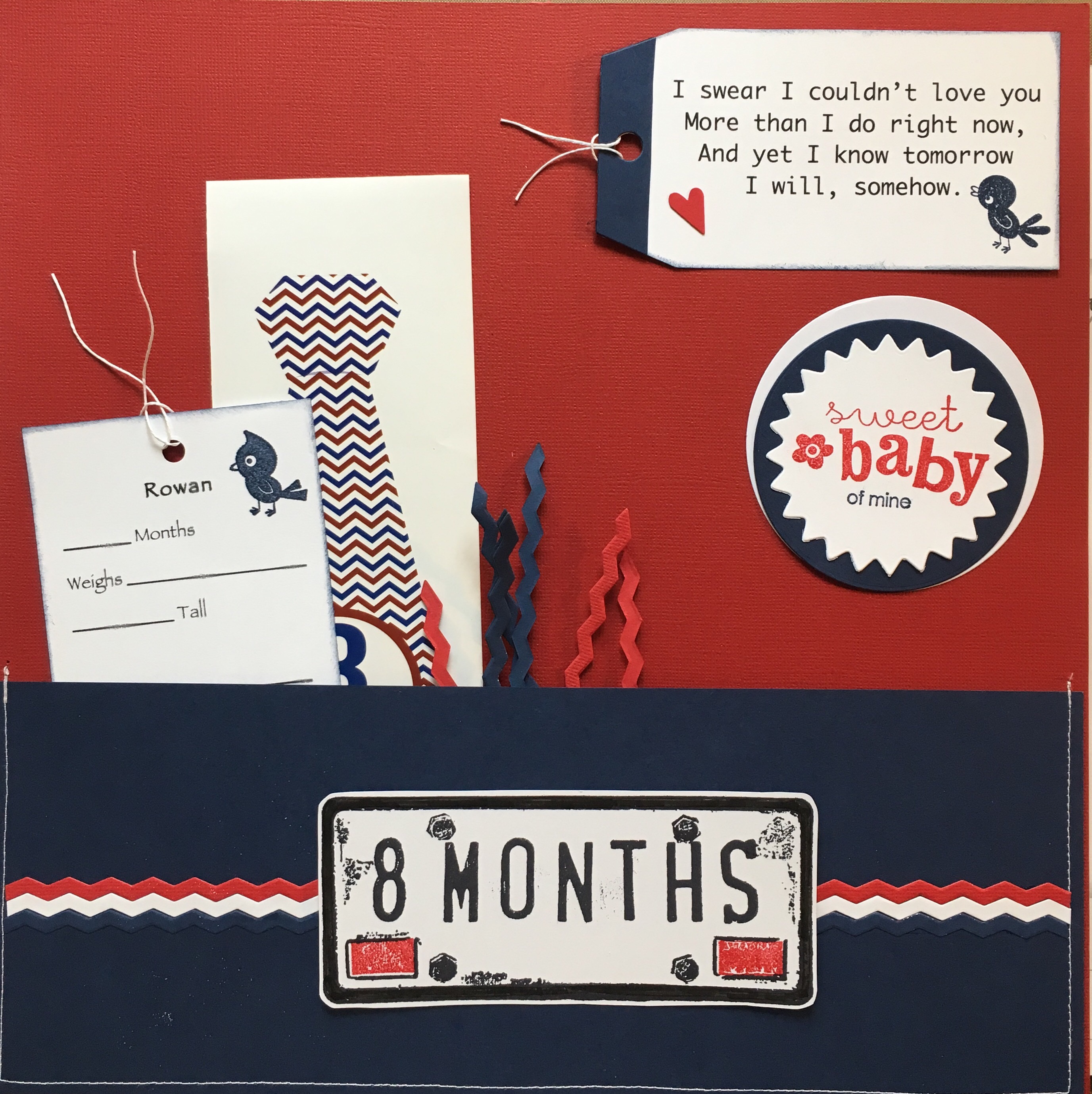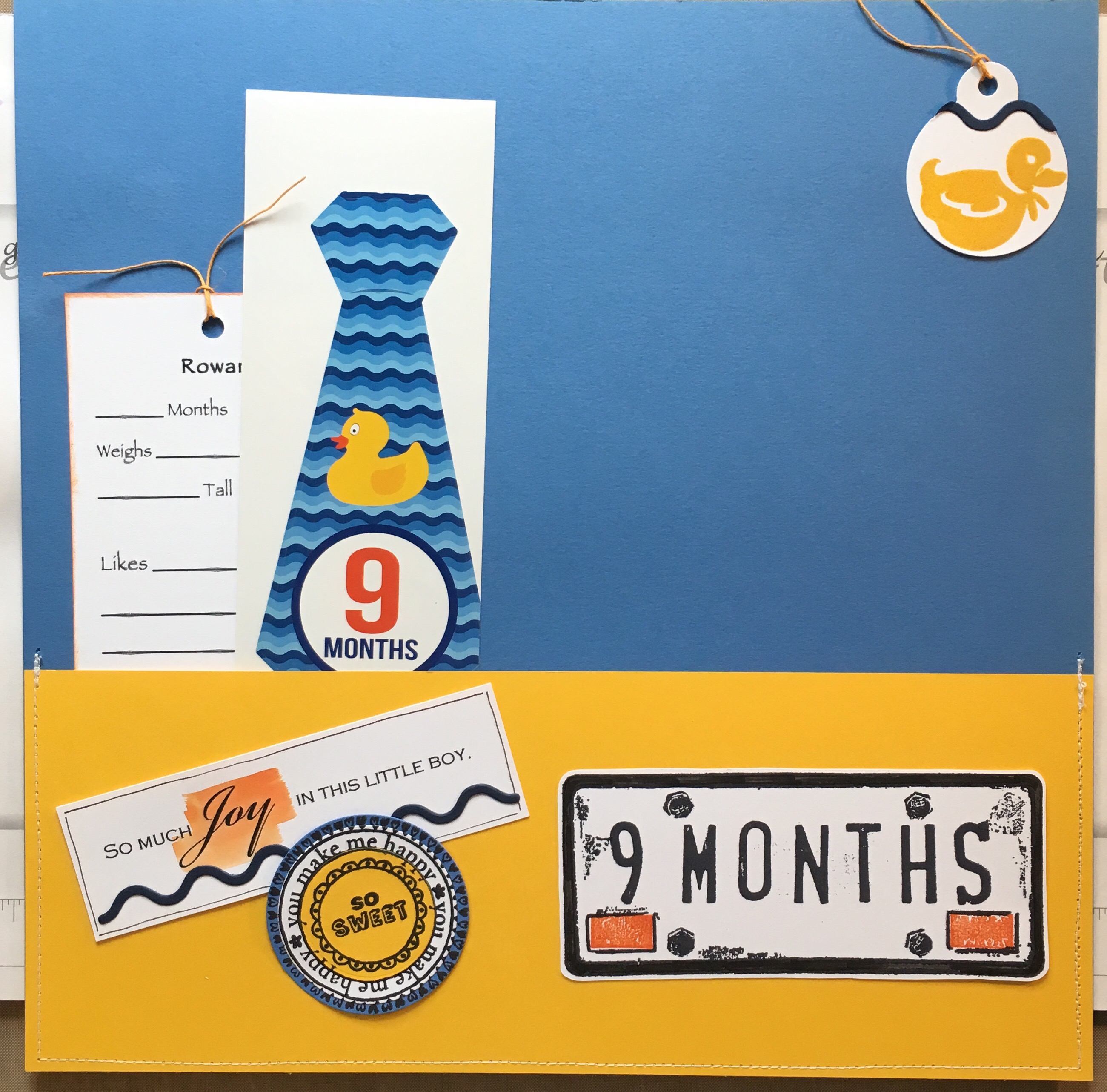 After nearly a decade drought of scrapbooking I dived back in to create this album for my little grandson due in November 2017. I ordered some belly stickers from Amazon that covered 1-12 months and all the holidays (plus some extras) that provided a starting point. I used the stickers to coordinate colors and papers, then found quotes to add for each month. I created a tag to tuck into the pocket for simple journaling. All of the embellishments are adhered with temporary adhesive so they can be easily moved when adding photos and then adhered with permanent adhesive. All layouts include white card stock (or matching) and any leftover patterned paper used in creating the layout behind the page.