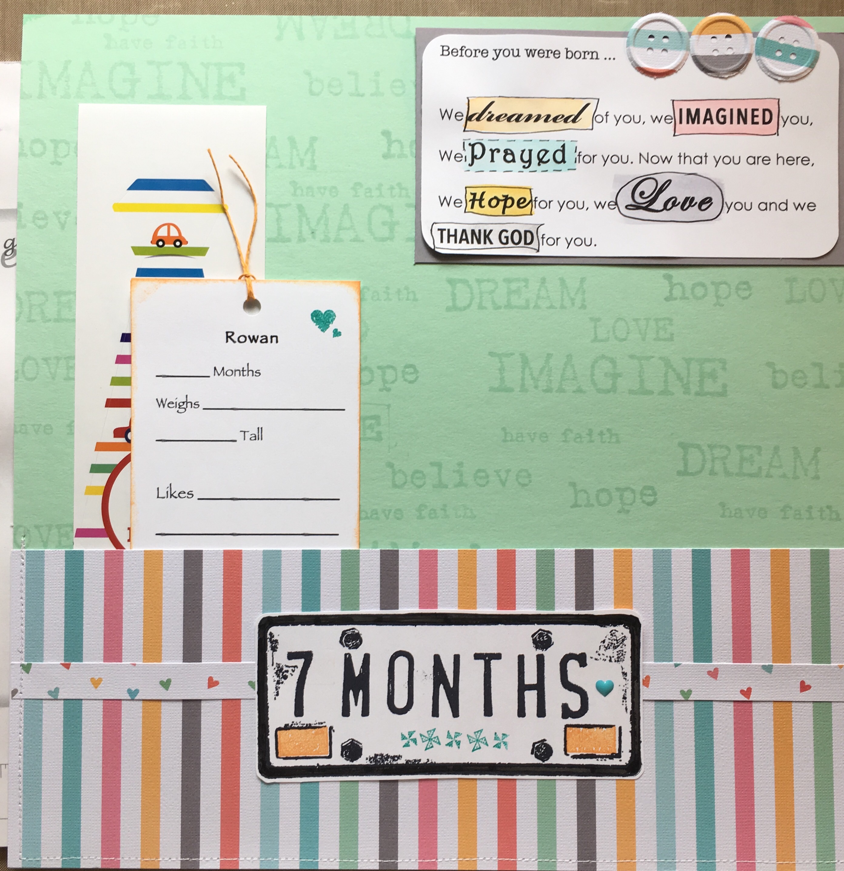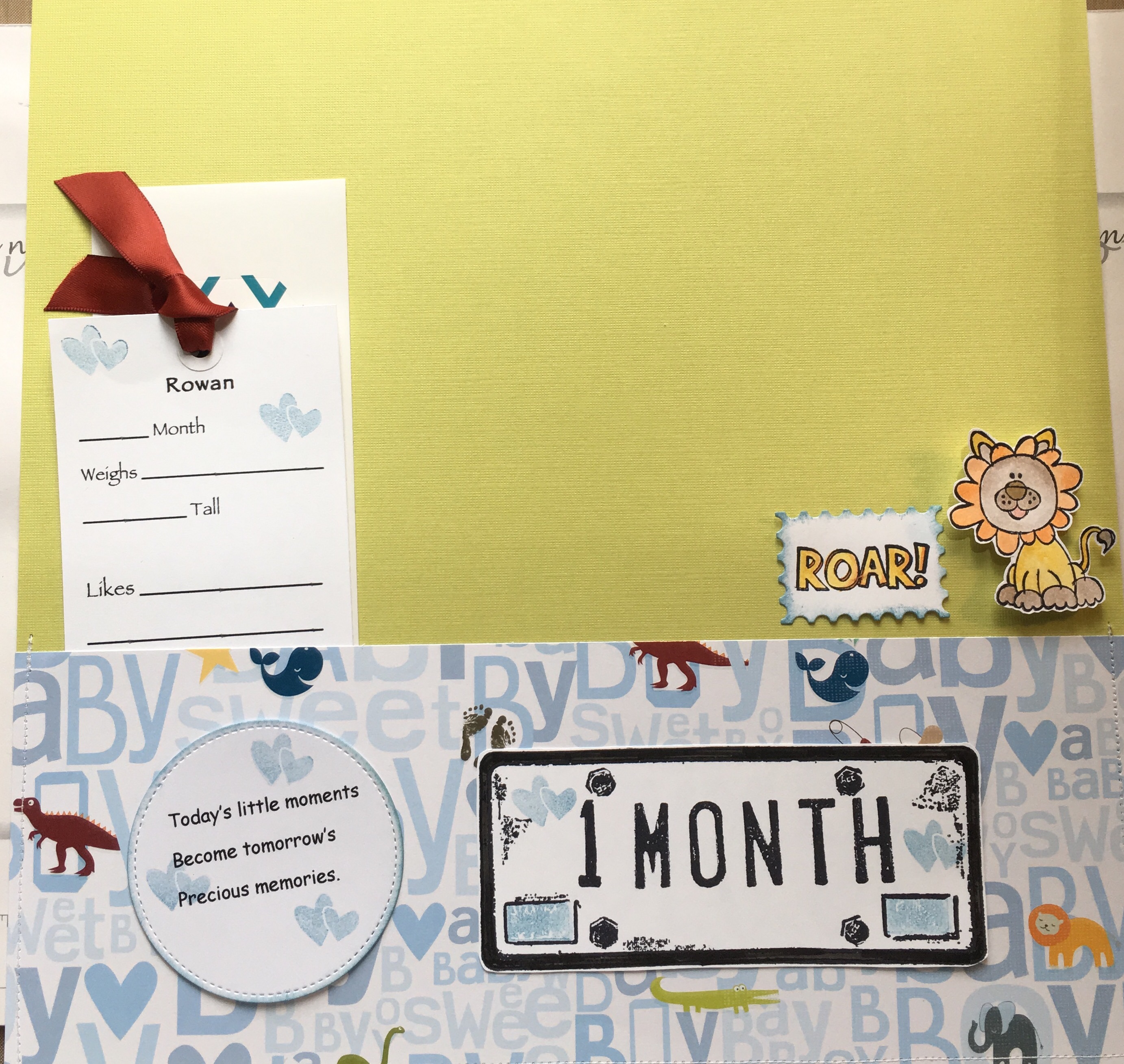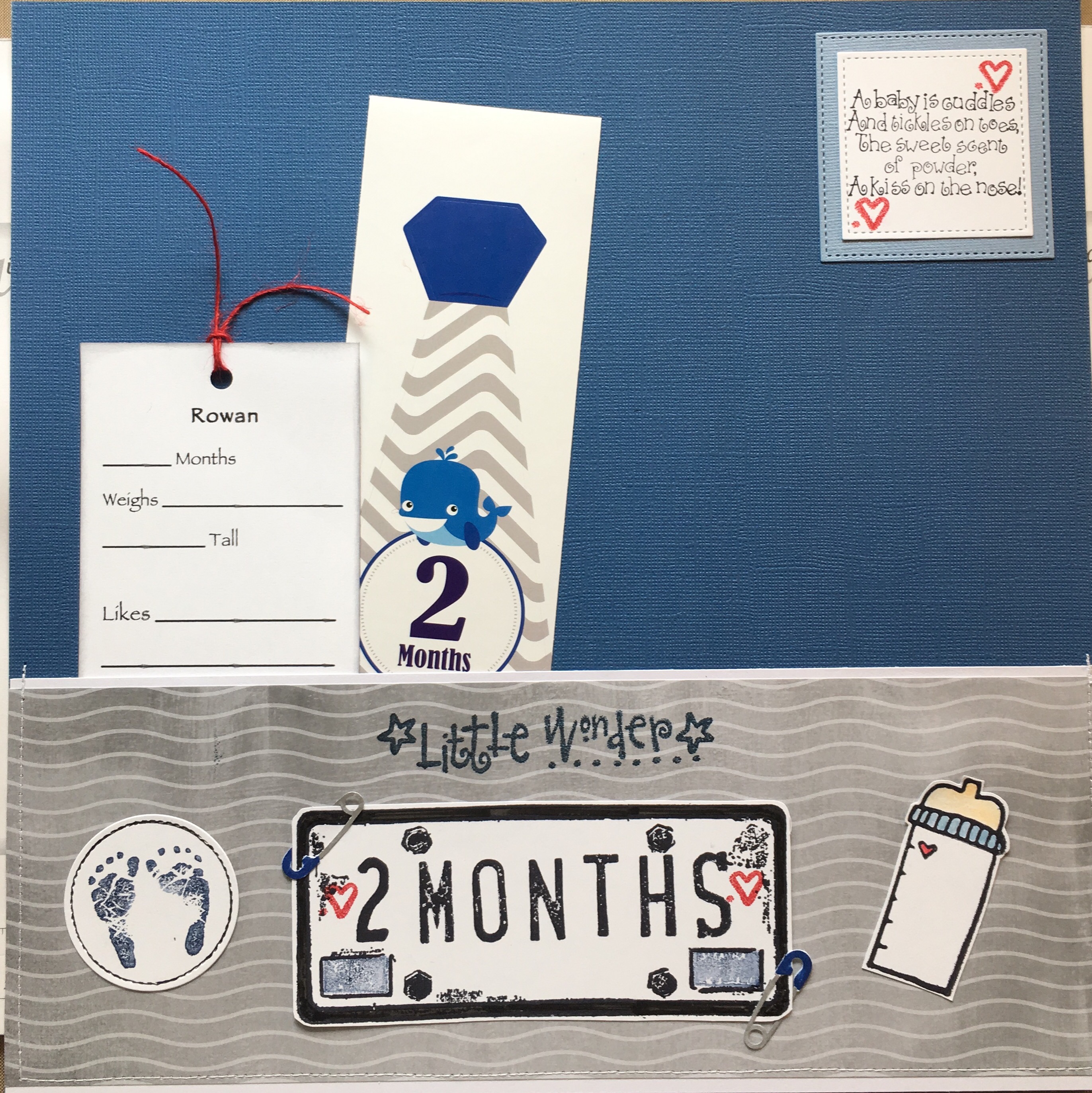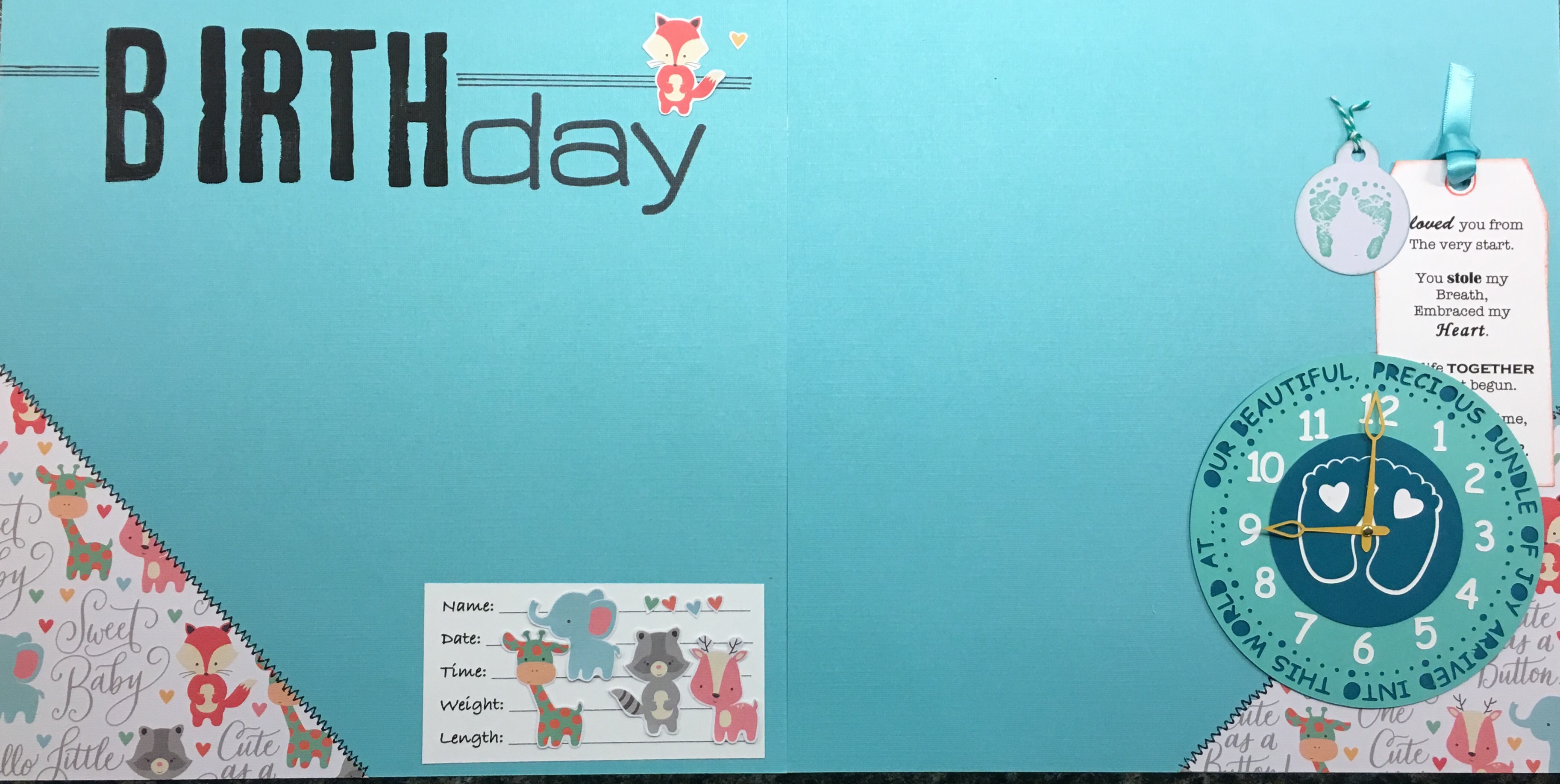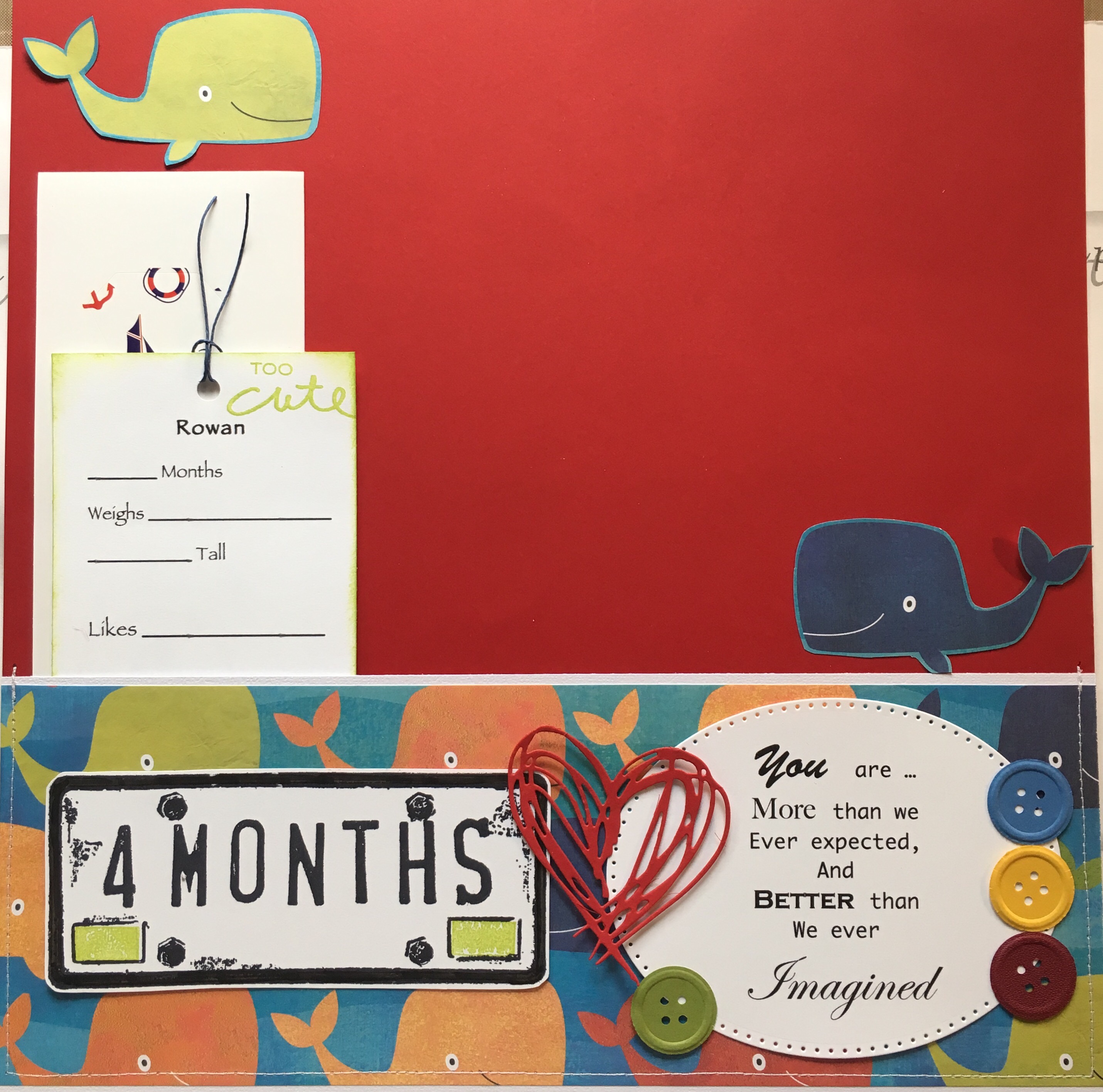 After nearly a decade drought of scrapbooking I dived back in to create this album for my little grandson due in November 2017. I ordered some belly stickers from Amazon that covered 1-12 months and all the holidays (plus some extras) that provided a starting point. I used the stickers to coordinate colors and papers, then found quotes to add for each month. I created a tag to tuck into the pocket for simple journaling. All of the embellishments are adhered with temporary adhesive so they can be easily moved when adding photos and then adhered with permanent adhesive. All layouts include white card stock (or matching) and any leftover patterned paper used in creating the layout behind the page.