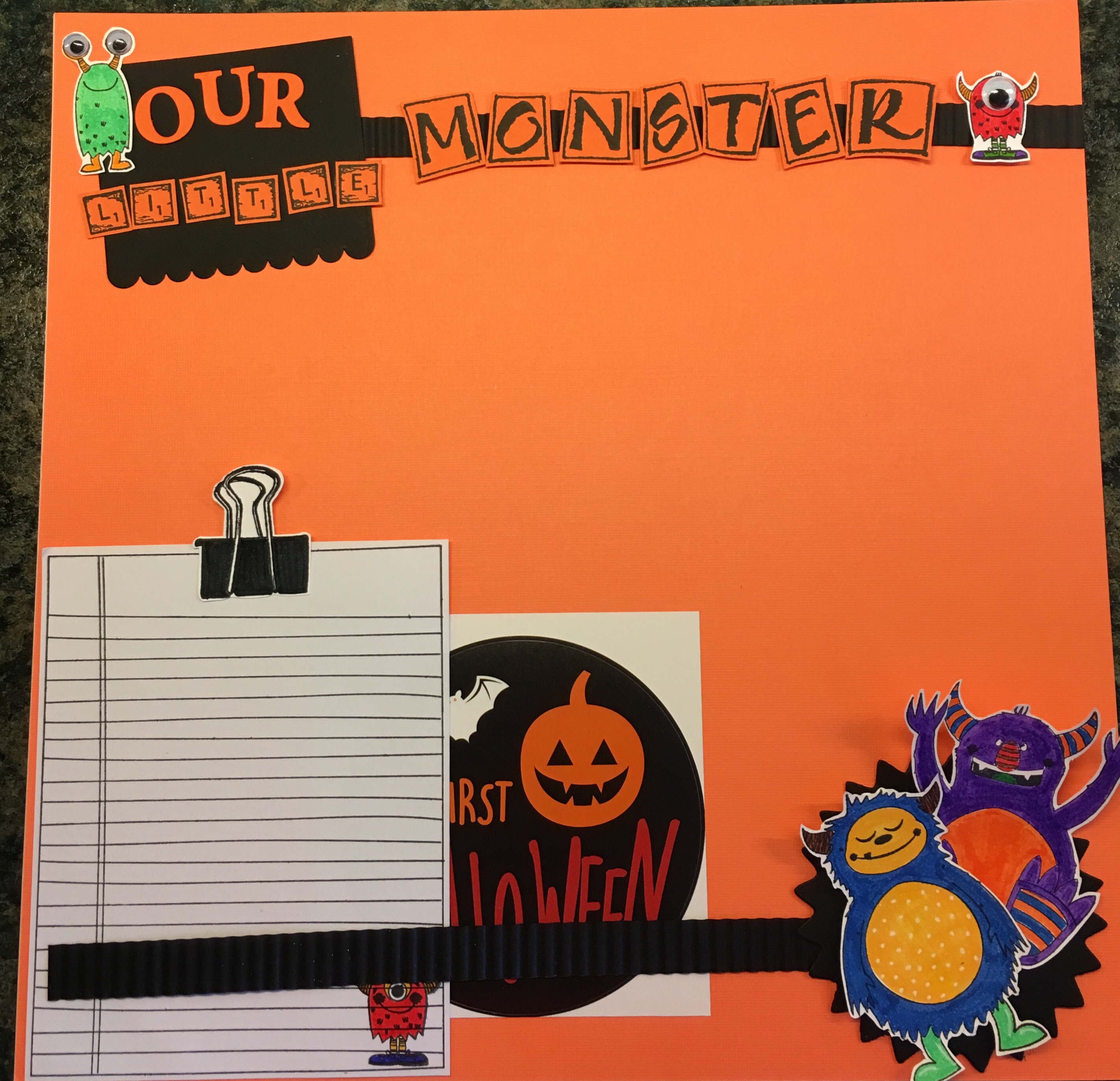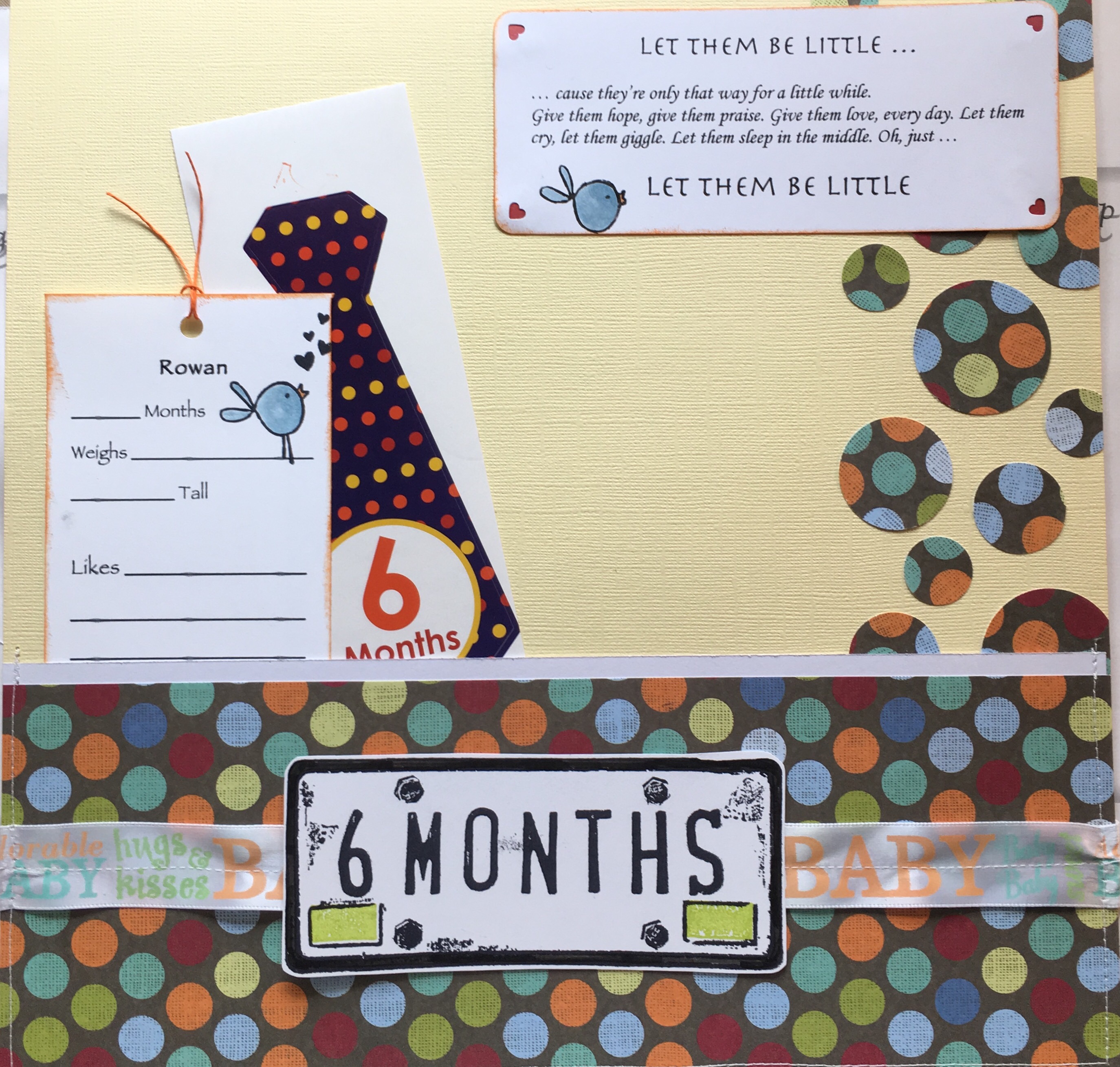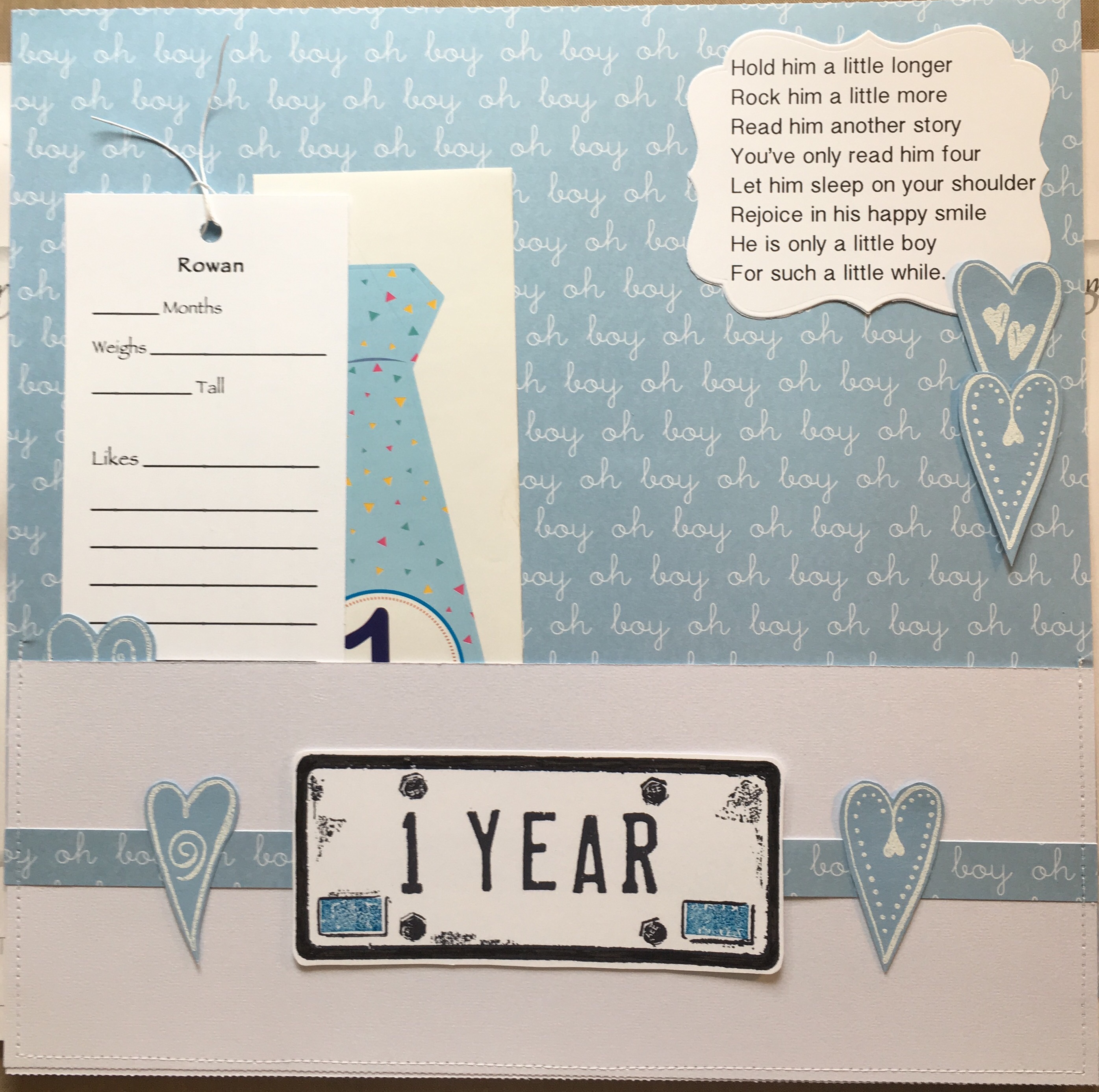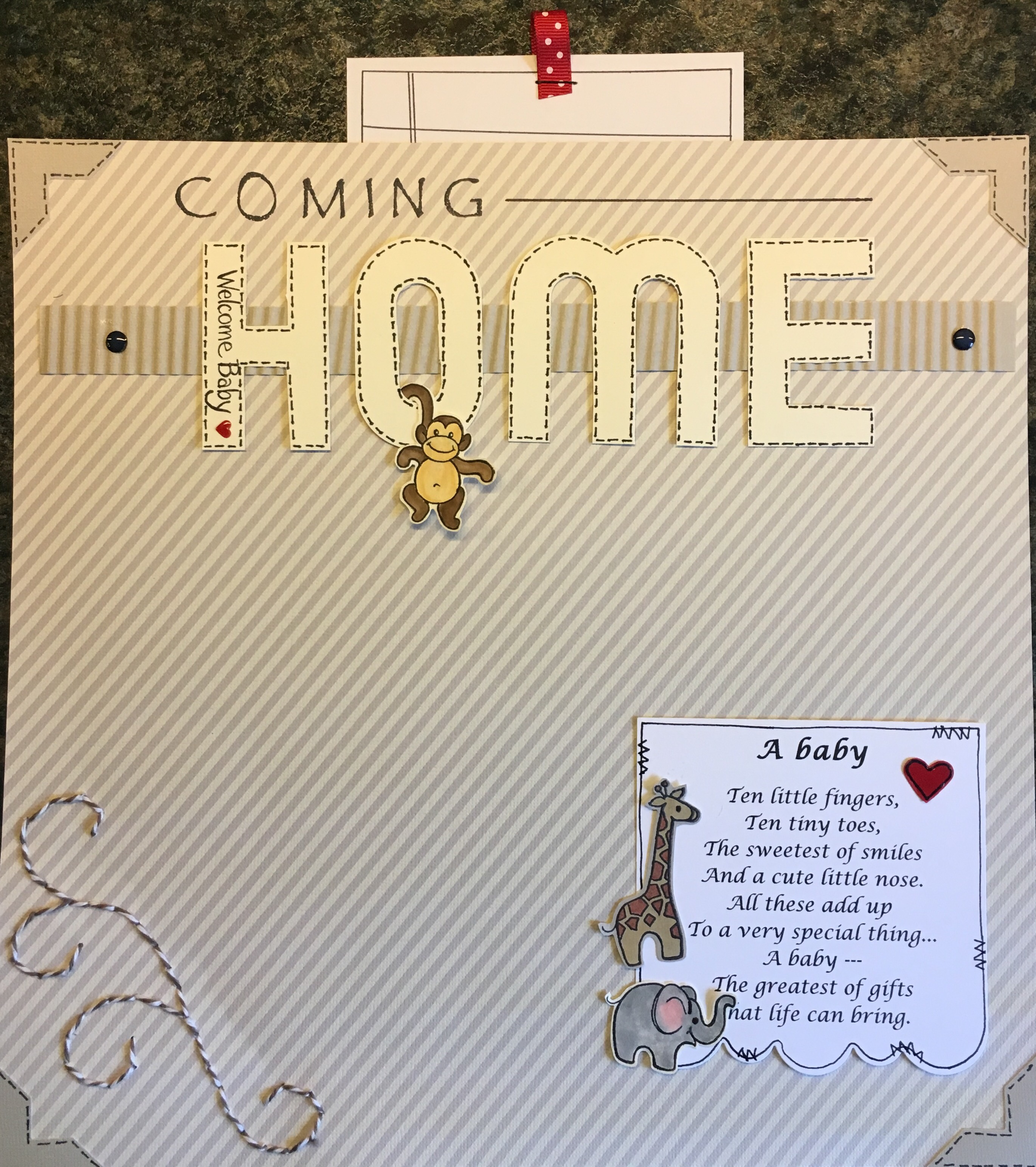 After nearly a decade drought of scrapbooking I dived back in to create this album for my little grandson due in November 2017. I ordered some belly stickers from Amazon that covered 1-12 months and all the holidays (plus some extras) that provided a starting point. I used the stickers to coordinate colors and papers, then found quotes to add for each month. I created a tag to tuck into the pocket for simple journaling. All of the embellishments are adhered with temporary adhesive so they can be easily moved when adding photos and then adhered with permanent adhesive. All layouts include white card stock (or matching) and any leftover patterned paper used in creating the layout behind the page.