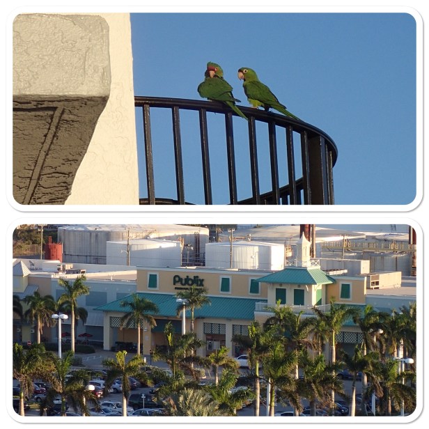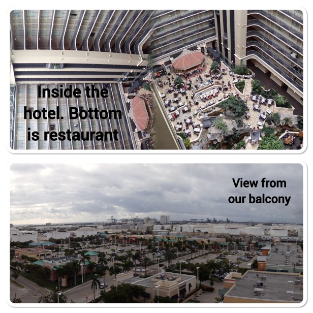 We stayed at the Embassy Suites just a few miles from the pier – a nice hotel but not worth the price without combining points. Location location location I guess. We were on the 11th floor and pretty nice room. While unpacking a few things a gorgeous green bird landed on the railing of our balcony (I use that word loosely – it was big enough for us to stand out there and look at the view but that’s it). By the time I could get my camera it was gone but I soon saw and heard several others flying around. I finally got a couple of shots I could send to Heidi (I knew she’d know what kind they were). She said they looked like Mitred Conures. I was hoping they’d come back in the morning but we didn’t see them again. We joined up with DE and Sarah to go downstairs for dinner and then back to our room. It had been a long day for all of us. We watched a little of the Olympics before turning out the light.