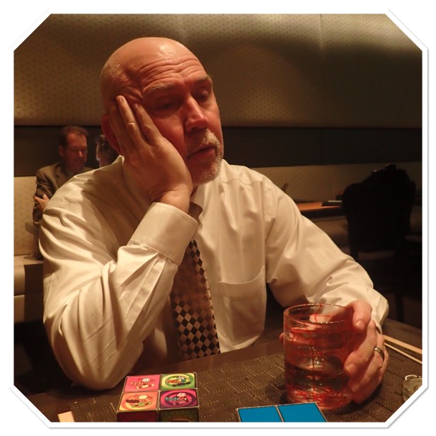 By the time we finished unpacking it was time to start getting dressed for our 6:30 reservation. And believe it or not, we were hungry. LOL Qsine was looking pretty busy (I guess lots of others had the same half price idea we did). Andre was our main server. He was awesome! I don’t know how these people stay turned on and so animated day in and day out. They’re simply amazing. He asked who was the captain at the table, the one who would make all the decisions. We all pointed our fingers towards DE or Theodore as he’s been lovingly dubbed this cruise. So Andre kept calling him Captain Theodore. It was great. We picked out 5 courses (Lava Cakes, Disco Shrimp, Filet Mignon, Chiatini, Kebabs). We were all pretty much done after #4. Everything was wonderful – I’m not sure I could pick a favorite. Then came dessert. Sarah ordered a Silver Bullet (gelato) and I ordered the chocolate tombstone. I wasn’t sure how any of us were going to eat any of it but still we ordered. Before our desserts came Andre brought the grass stuff to our table. We had been wondering what the hell was the deal with the grass. It had chocolate covered strawberries in it! Yummmm. So good! Sarah wasn’t crazy about the gelato so gave that to Bob. I had no issues with my chocolate dessert. It was wonderful. THEN Andrea brought out this chocolate cake thing with candles and a ribbon that said “Happy Anniversary” on it for DE and Sarah. Awwwwwww. So sweet! The cake had a weird texture and none of us cared that much for it but it was still very sweet and kind. DE was done, can you tell? Isn’t that the same look he had last time we finished up at Qsine?