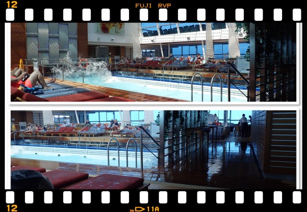 Once we got our lazy butts up and moving this morning we grabbed some breakfast at the Aqua Spa Cafe. All the chairs around the Solarium pool were already taken at 9am. Crazy. Lesson learned. Sarah had called to say they were heading to the spa to sweat out some toxins – DE wasn’t feeling too good. After we ate we wandered up that way to see if any of the heated benches were available – and found the Williams’. (I have a pic of DE praying, but I won’t add it. He has a blackmail pic of me drowning so …) He really wasn’t feeling too good. He says he remembers most of the day/night but there is a black hole at some point. He totally doesn’t remember eating all that pizza Sarah went to get for him. And a roll too! DE doesn’t eat bread. Or pizzas. But he did last night. And doesn’t remember a thing. He swears Sarah gave him a mickey. He doesn’t even remember going to sleep. Sarah pointed out there’s a difference between going to sleep and passing out. LOL