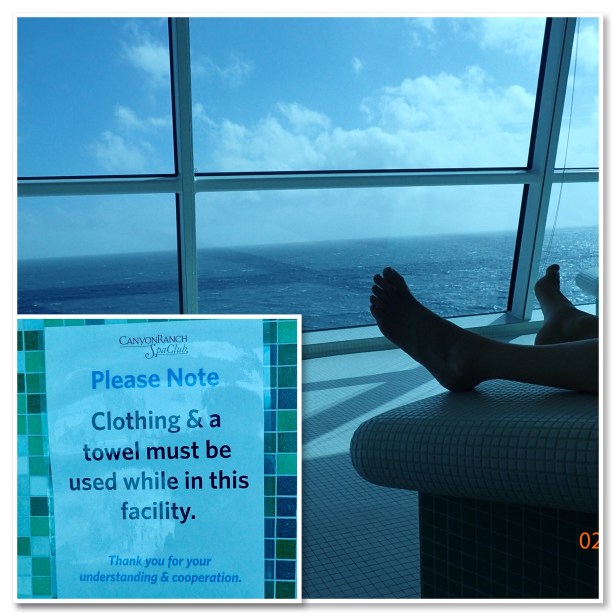 Once we had our fill of the heated benches we went downstairs to the relaxation lounge for some more, well, relaxation. LOL It’s located at the bow so we got an eagle’s view of the bobbing up and down over the waves. I know that really bothers some people but I just love it.