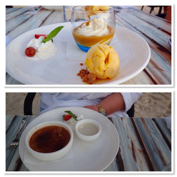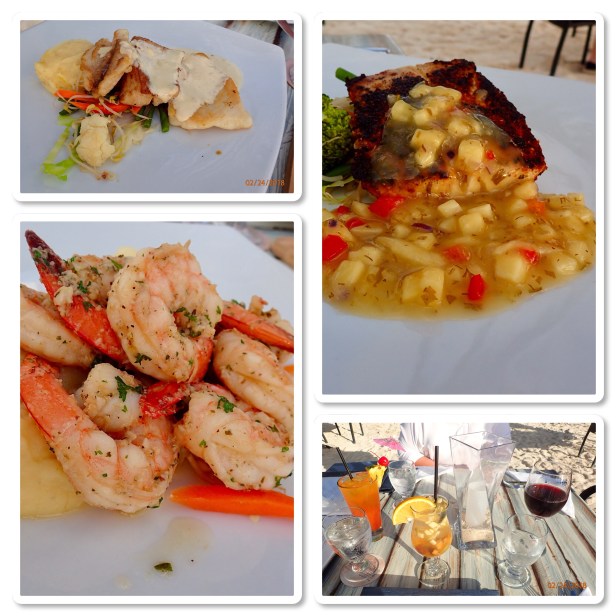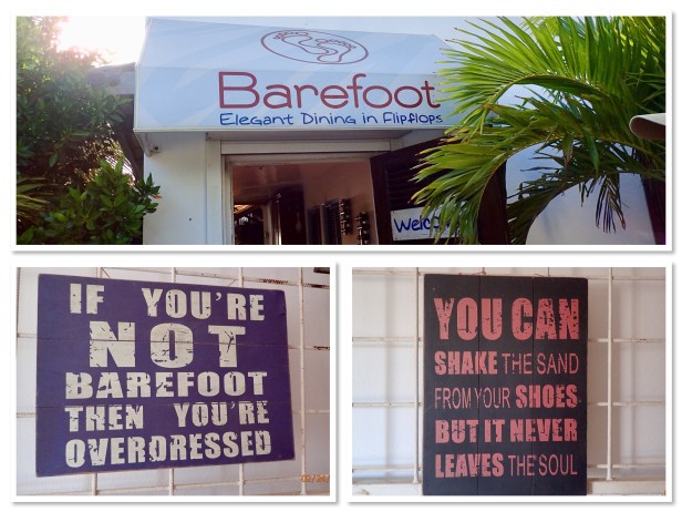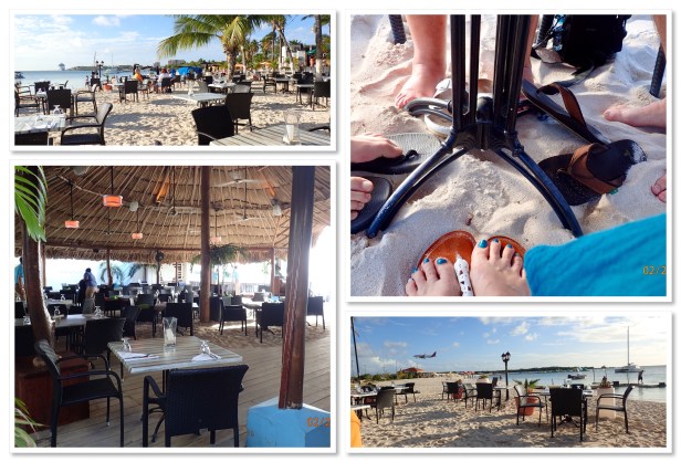 Since we didn’t know exactly how long it would take to get a taxi and get to the restaurant we met on the dock around 4:15. Figured if we were early we’d just wait. The prime tables were first come first serve. Wouldn’t you know it, there was a cab right outside the port that could take us. Even with traffic we were at the Barefoot Restaurant in 15 minutes or so. They didn’t even open until 5:00. So we just waited. Seated a little after 5:00 the sun was still strong and it was quite warm. But we were on the beach with our feet in the sand!