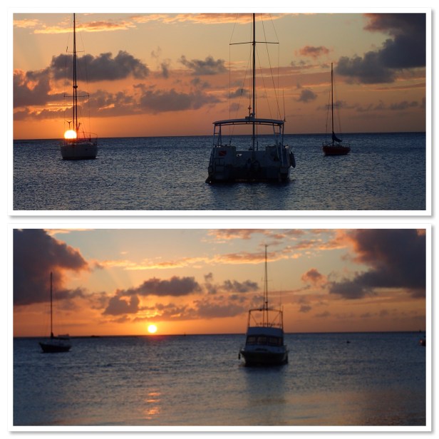 We started out with drinks and Dutch style crab cakes for an appetizer – awesome! DE and Sarah demonstrated how to do tequila shots – video. Bob and Sarah ordered the blackened mahi mahi and couldn’t say enough about it. My entree was garlic shrimp and it was also wonderful. DE ordered a trio of fish that made him feel stuffed to the gills. They had coffee creme brûlée and he was too full to eat any! What? So Sarah ordered it instead. It was yummmy. Bob and I shared a strained Greek yogurt with white chocolate and fruit compote kind of dessert. It was also wonderful. All this time tables are filling up left and right and the clouds have parted, for the most part, and that big orange ball is sinking. Colors are starting to fill the sky and everyone is snapping pictures all over the place. (My card reader is not working for some strange reason I haven’t been able to figure out so it looks like I won’t be able to really see any of my pics until we get home. It really bites!) Hopefully I got some decent shots. Our taxi cab driver on the way back to the ship highly recommended we try The Flying Fishbowl next time too. Said it’s a little further up but worth it.