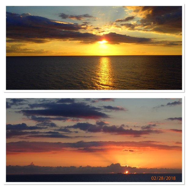 Since I don’t really need to say but so many times that we vegged out, read, napped, drank, ate, etc. I’ll just say it once for the next two days. They were sea days. We crashed. Especially the first day. I guess Bob and I needed to do nothing. We even grabbed burgers from the grill for dinner so we didn’t have to dress up that night. And we didn’t go to the show either. The second night we didn’t care for the menu at Blu so grubbed out and ate dinner at the buffet.This is the sunset from our balcony the first day …