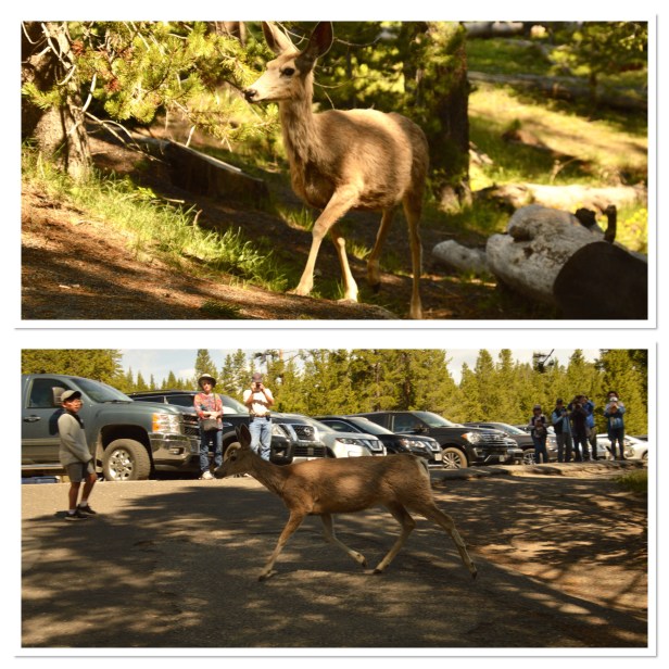 There were still some spots around the canyon we hadn’t seen yet so thought we’d try those before coming back for lunch. Buses. And people. Holy hell. There were a few parking spots left at the lower falls (same spot from last night) so we grabbed one. So. Many. People. And again, this is off peak. In fact this area (Canyon) just opened up on June 2. At least the plus side to other people being around is someone is usually offering to take pics of you together. We met the most wonderful couple from London up on that lookout. We must’ve talked with them for 10-15 minutes. One of my favorite parts of traveling is meeting different people. We decided the rest of those spots along the north rim can wait until this evening when most of the people are gone. On the way back to the car we ran across a couple of deer off in the trees. Why I had to stop to take pictures of deer is beyond me, but I did. It’s not like we don’t see them in our yard where we live.