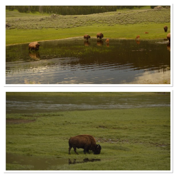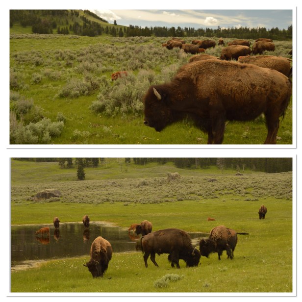 Lamar Valley is on the other side of Tower and it was still early so we turned in that direction to see if we could find more interesting shots. It didn’t take too long before we saw cars pulled over (or sometimes just stopped in the middle of the road). It got kind of funny because if saw just one or just a few, we’d keep right on trucking. But when we came across a herd we hit the brakes. Look at all the little babies!! So cute!!