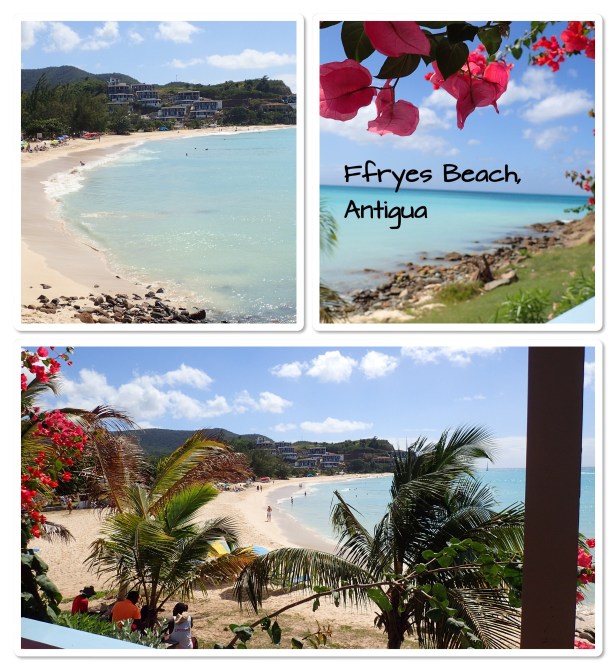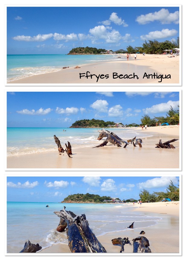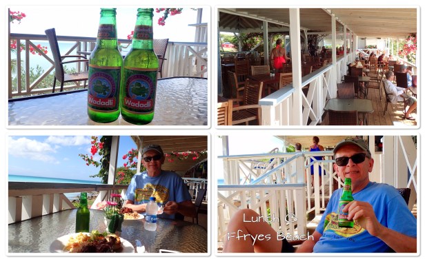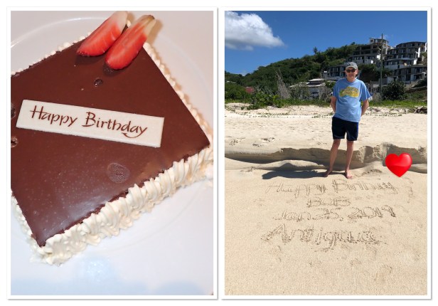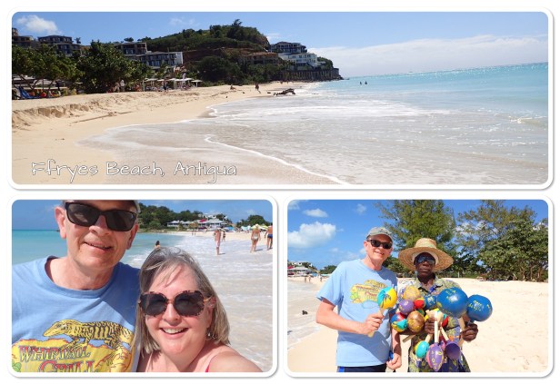 St. John’s – Happy 62nd Birthday to Bob!! I ran into Volkan at breakfast this morning and was able to book our dinner in Tuscan tonight for a reduced price for Bob’s birthday – yah! We had booked an excursion through the ship today going to Ffryes Beach. Antigua has 365 beaches – crossing our fingers this was a pretty one. The price was right and it included a lunch. It turned out to be a great choice! The beach was beautiful, there were plenty of chairs and umbrellas and lots of sand. Unfortunately, it was still very windy (the tour operator, Chrissie, told us there was a tropical depression spinning somewhere out in the Caribbean which was causing all the wind and waves) and the water was rougher than you’d expect – though not as rough as Rainbow Beach yesterday. We enjoyed about four hours there and other than weather conditions it was perfect. Lunch was delicious and I fell in love with one of the local vendors – picked up a hand painted beach dress and a handmade Christmas ornament. Those are the kinds of things we love to bring back from our trips. ❤