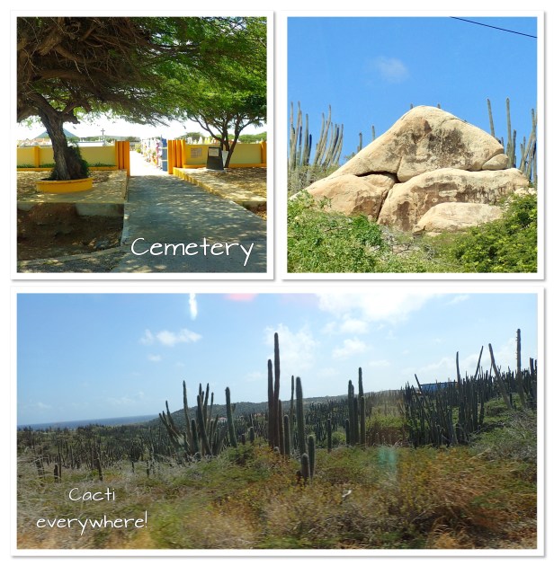 I thought Arizona had a lot of cacti. I think Aruba has them beat. Honestly they’re like trees at home. They are everywhere! And huge! It was fascinating seeing the acres and acres on our drive throughout the island today. We learned there are seven districts on the island and there is a Catholic Church, graveyard and school in each one. Eighty percent of residents are Catholic so it’s the main religion on the island.