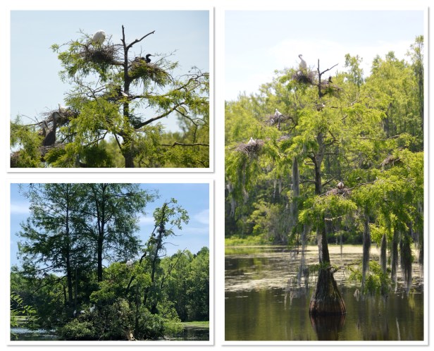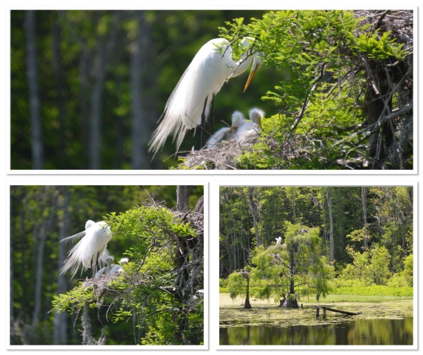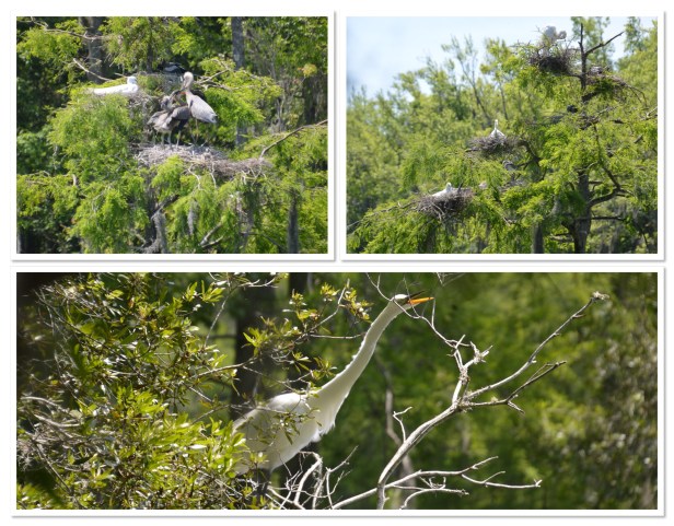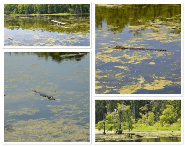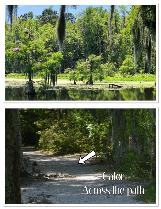 We still thoroughly enjoyed seeing all the nests of herons and egrets in this area. There are tons of them. These are big birds and they have no issues sharing these trees with each other and creating communities. We even saw them helping each other build their nests. Amazing. The gators cruising the water was a little unnerving I have to say. It’s a pretty narrow path winding through the swamp (and normally water on both sides) and the gators just slide through that water watching everything with their beady little eyes. And wouldn’t ya know it? About the time we decide that the 100 pics we’ve each taken of white birds in this tree is enough and turn around to head back to the car, this dude decides to crawl right up the bank, right across the path and plop down for this afternoon siesta – about 30 yards from me. Freaking out I turned around and hightailed it in the other direction. We waited a few minutes to see if he was going to continue across the path on the other side or not. Not. So, adding at least another mile to our walk back to the car, we just headed in the opposite direction – hoping another one didn’t decide to do the same thing up ahead of us, blocking us in. Crazy. The fixes we get ourselves into.