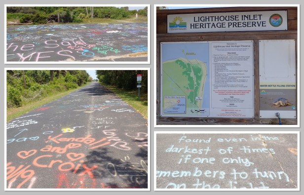 The drive to the lighthouse wasn’t far. It now sits in the water so you can’t actually get to it (except at low tide we’ve read). The half mile paved road the beach was littered with graffiti with everything from “so and so was here” to names or initials in a heart to inspiration sayings. I guess next time we come we need to bring paint so we can leave our mark as well.