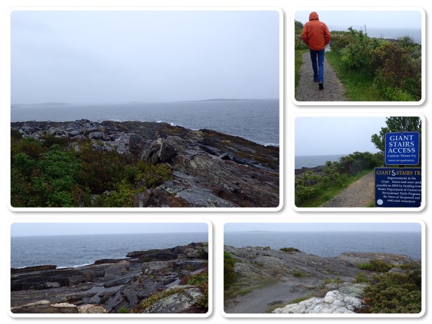 Bob had read about these Giant’s Stairs in Harpswell about an hour away. Since it was a nasty day we figured we may as well drive out there and check it out. (Didn’t want to hang out in a hotel room anyway.) The rain wasn’t too bad, a little drizzle here and there but nothing a rain coat wouldn’t handle. Since it was now lunchtime, we were hunting for a place to eat before we checked out the stairs. The Nav wouldn’t find the Giant’s Stairs but it WOULD find the The Giant Stairs Seafood & Grille Restaurant. Sounds nice, right? Hmmmm. It was another little hole in the wall (which can be just fine). It was okay. Bob’s wrap was better than my shrimp, but it served a purpose and we moved on.