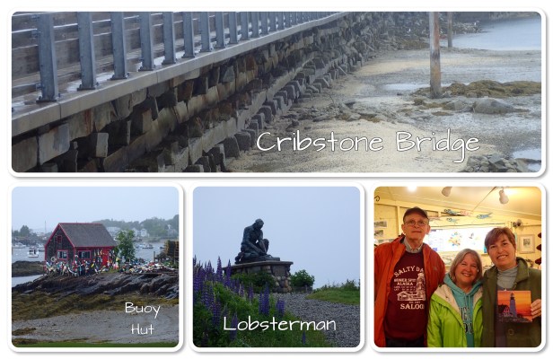 Trying to find this little “gem” was way more interesting than the “gem” itself. It’s located on Bailey Island, which is connected to Orr’s Island and the scenery was beautiful – even on this rainy day. The houses were gorgeous and all the waterfront properties with docks leading to the water were jaw dropping – but in a modest way. Nothing like what we saw in Newport, RI. It was a very cool place that was interesting to drive through. We picked up a map in the restaurant at lunch that listed all the businesses on the island. We passed one of the arts and crafts places and pulled in. Cute little building filled with nothing but pieces from local artists. Immediately I picked up a little lobster Christmas ornament. As we were walking around we saw a lady painting on a small canvas. Come to find out she’s the daughter of the owner (who lives in Savannah and knows the artist we discovered on the riverfront and came home with two of his pieces) and has just recently started painting again. We loved that she only had works of local places. There were a couple of beautiful Portland Head Lighthouse pieces we loved but she also had several of “the steps.” I wanted to see “the steps” before we chose, so off we went. Of course now was the time the raindrops started falling in earnest. It was full out raining at this point. Still we parked, suited up and started walking. It really was anticlimactic. I’m sure it would’ve been different it the sky was blue and we could’ve actually climbed the steps but we couldn’t. We only went a little way (the whole trail is only 1/4 of a mile) before we turned around. On the way back to the car we decided to stick with getting one of the Portland Head pieces. Before we got out of there she showed us a card collection she designed that reflects four places of island history – the lobsterman, the buoy shack, the cribstone bridge that connects to Orr’s Island (very cool story there) and the Giant’s Stairs. So we got those to frame as a momento of our trip to Bailey Island.