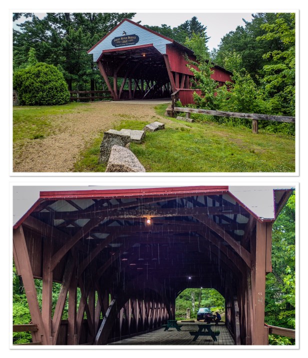 Next up was Swift River Bridge, built in 1850 and was put out of commission in 1974 when a concrete and steel bridge was built nearby. It now houses some picnic tables for the area and a couple was taking advantage of that to escape the rain. (You can see how hard it was raining in the bottom pic.)