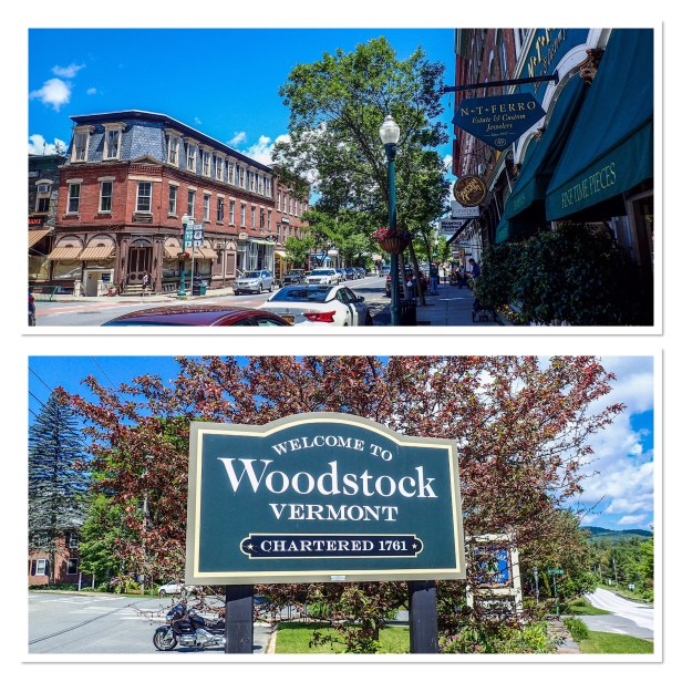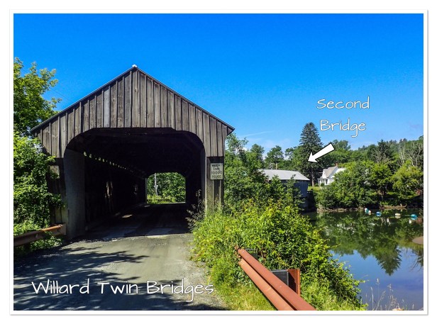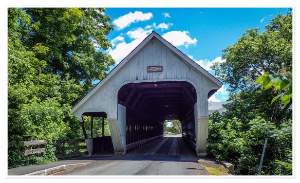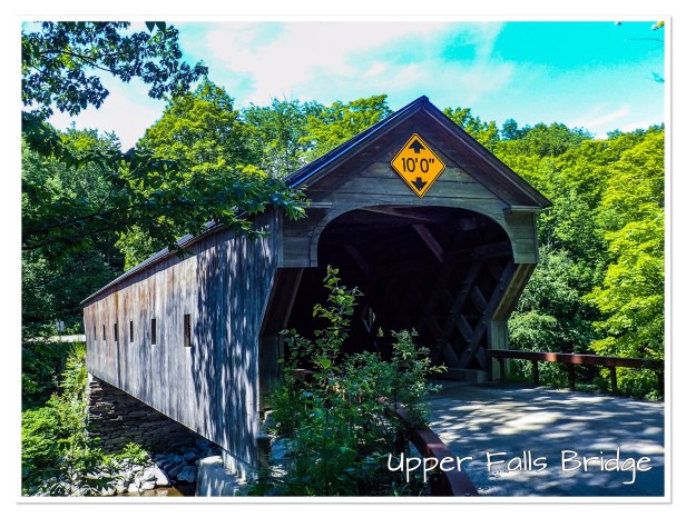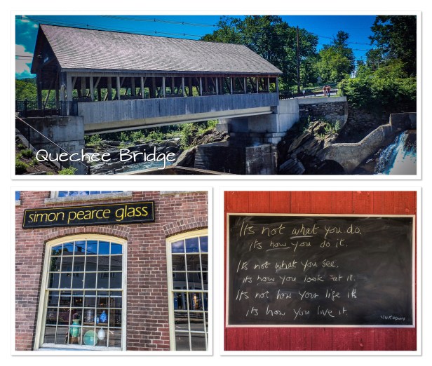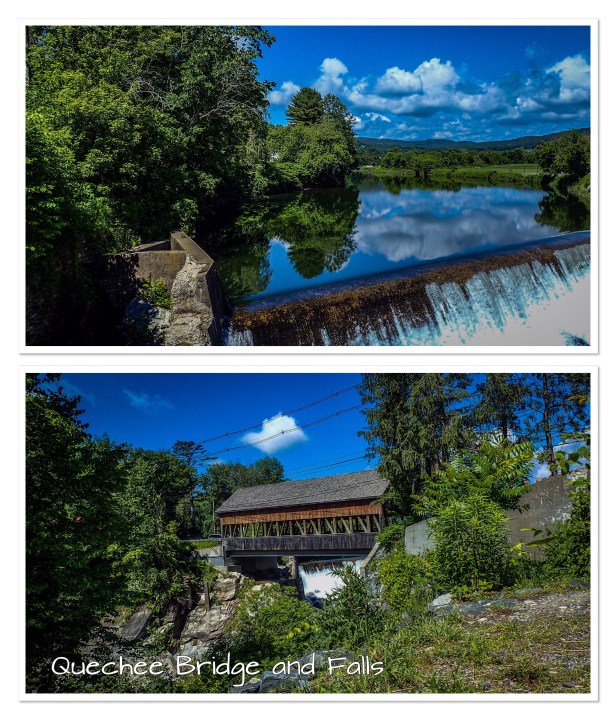 Wednesday (June 26) – Vermont was only 1-1/2 hours or so to Hartford where our hotel was so we were in Quechee pretty early. Stopped in the Visitor Center to see if there were any pamphlets or maps showing Vermont covered bridges (loved the one we had for New Hampshire) – there weren’t any. So we’ll have to wing it more or less. But Quechee did have a covered bridge and waterfall next to it. Would’ve been a lovely spot for photos early morning or late evening. The sun was so bright the falls are very washed out but it’s still a pretty place.