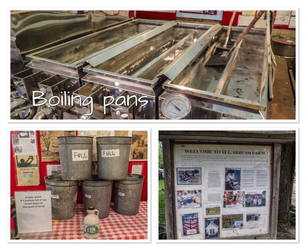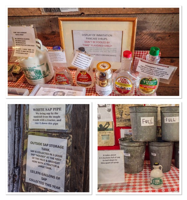 Since we had to backtrack to go to the hotel and went right past the Sugarbush Farm we stopped there and did the cheese and maple syrup tasting thing. It’s a pretty cool place – an old working farm that’s still a family business. We tasted all kinds of cheese (bought a couple of them but all were good) and the four maple syrups they had. It was interesting to learn about the syrup and how it’s harvested and the process of boiling the sap into syrup. Most maple syrups on grocery store shelves are cut with corn syrup and/or high fructose corn syrup. When you realize it takes about 45 gallons of sap to end up with one pint of syrup you can understand why those big companies do that to stretch the real stuff. The sap can only be harvested on days when the temps have dipped below 32 deg at night and rise to over 40 deg during the day. Like all farmers, they are totally dependent on the weather for harvesting. Some years they have more days to harvest than others. We also learned about the different colors of syrup. Early in the season the syrup is light and as the season progresses it get darker. The flavor also gets richer with the progression of the season with it being the darkest and richest at the end. Very cool stuff. We may or may not have dropped a few dollars before leaving this place.