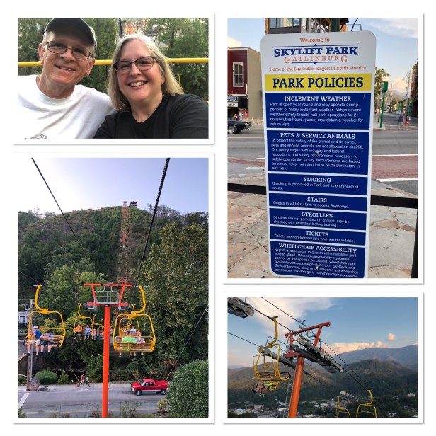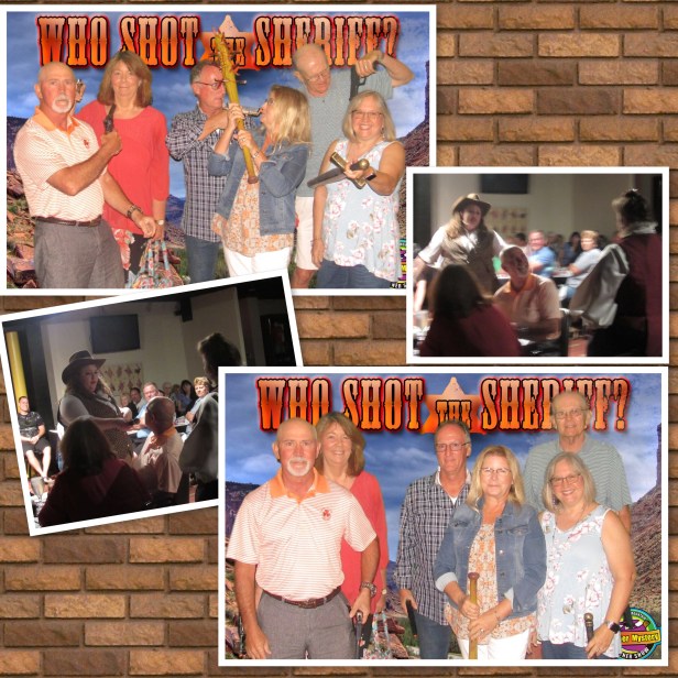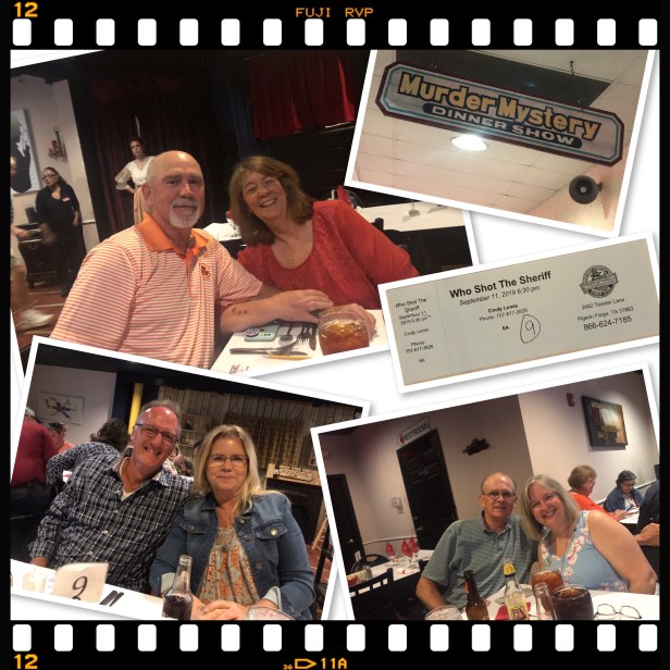 Wednesday was our last day of crafting while the guys played golf again. But we all got cleaned up for our night out going to the Murder Mystery Dinner Show in Pigeon Forge. I gotta say, it was kind of hokey but it was fun. Dinner was good old comfort food and the laughs were plentiful. DE was chosen to be one of the extras to be in the show. He was a major hit! He practiced his part and executed it to a tee! Even had people come up to him afterwards and tell him how much they enjoyed it. (That boy is multi talented!) I’m happy to say there were several at our table (the whole “9” thing continued – we were at table #9) solved the murder correctly. And that’s all I can say about that. After all, we took an oath before we left. For real.