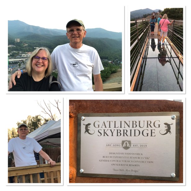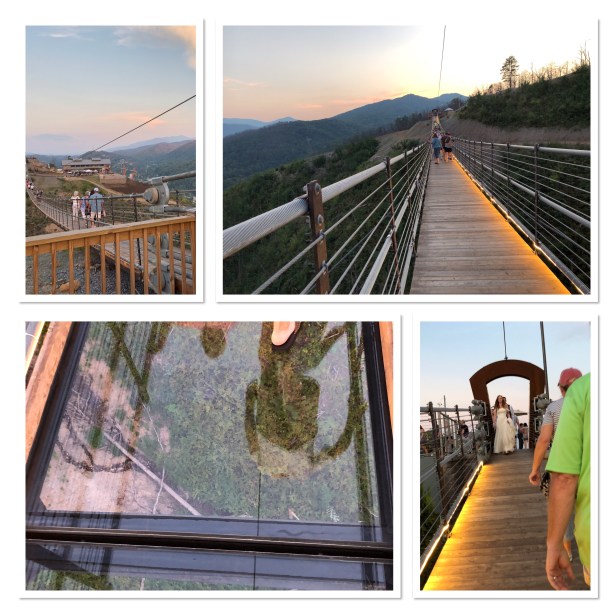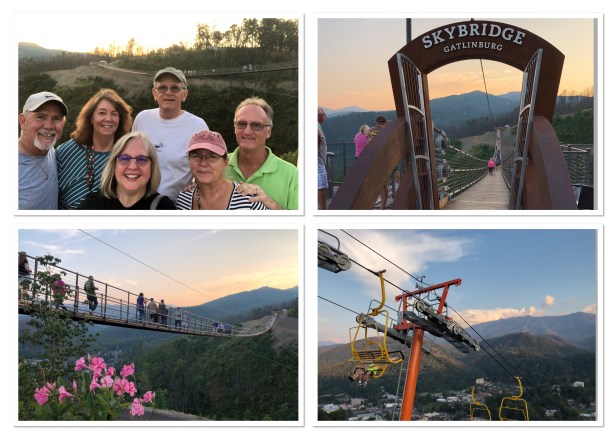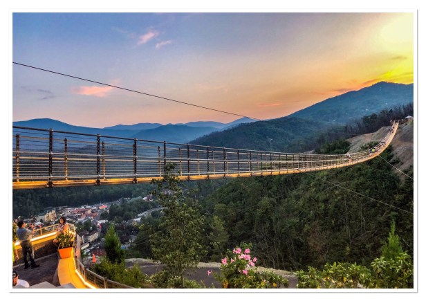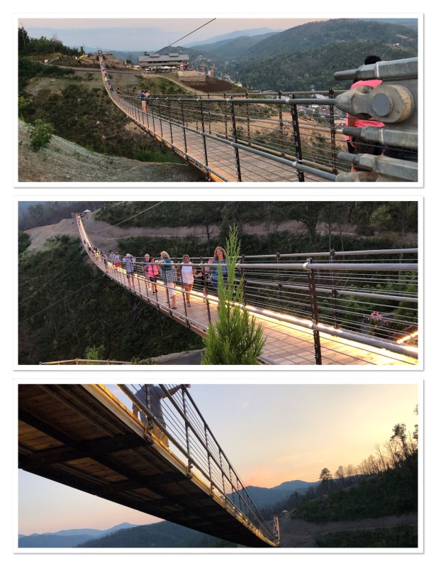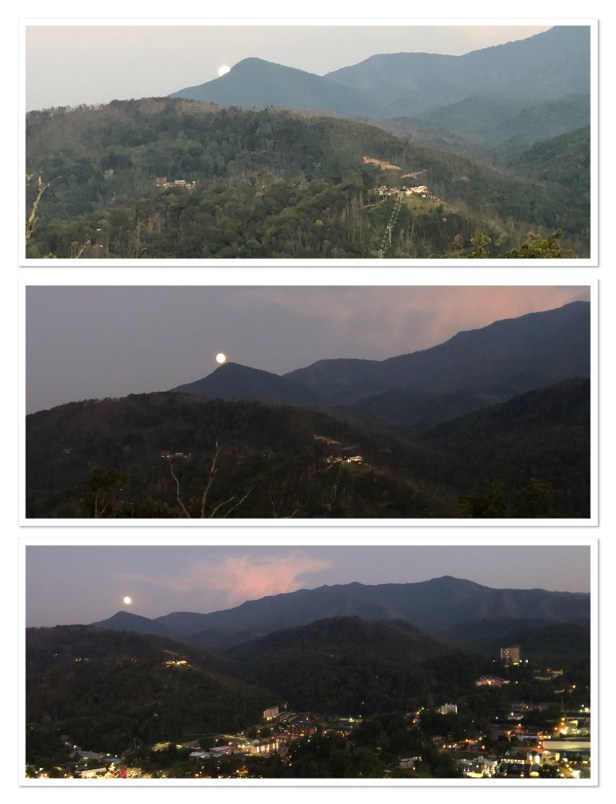 It was around 2pm by the time we got back to the cabin and too later to start crafting so we started gathering stuff up for packing. So sad. But we had plans for dinner and the evening. After Chef Cindy prepared our mouth watering dinner of shrimp and pasta we all piled into the car and drove into downtown Gatlinburg to walk the new Sky Bridge. It was just completed earlier this year and has gotten rave reviews. At $19-$23 a pop it’s not a cheap thrill but something we figured we needed to do at least once. It was magnificent! The views are amazing. This bridge is the longest (680′) pedestrian suspension bridge in North America. You don’t really get a sunset because the sun goes down behind the mountain but it’s still a spectacular setting. As we were heading down I happened to get a glimpse of the moon rising behind the mountain and remembered the next night was a full moon, so tonight was going to be awesome as well. We hung around and took image after image watching that big ball rise in the sky. It was awesome!! Pictures don’t do it justice, but the experience will never fade.