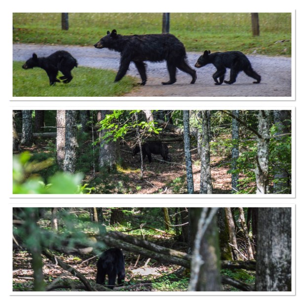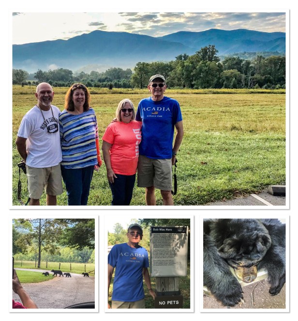 Monday morning came quickly. We were in the car and headed out by 6:45 am heading to Cades Cove. It’s about an hour drive and the best chances of seeing animals is early in the morning – or at least that’s the theory. Even if you don’t see animals though, it’s just a beautiful place in the park. And it did not disappoint this morning. The sky was simply amazing and we were treated to views with low lying fog that adds so much to the landscape. We met the Mayor of Cades Cove and his wife Shirley on bikes – they were a hoot! We stopped to take so many pictures of the scenery – it was addicting. Around every bend was a different viewpoint. Of course we are constantly looking for bears as well. Those expectations were met in full force. We saw 9 bears while we were there. Nine!! On September 9! Of course there were deer and turkey and all the usual Cades Cove residents as well but the bear is usually the most exciting. Seeing a mama bear with her three cubs was so exciting! Between stopping to take scenery pictures and animal pictures we managed to kill most of the morning before calling it a day. But we left feeling like we hit the mother load.